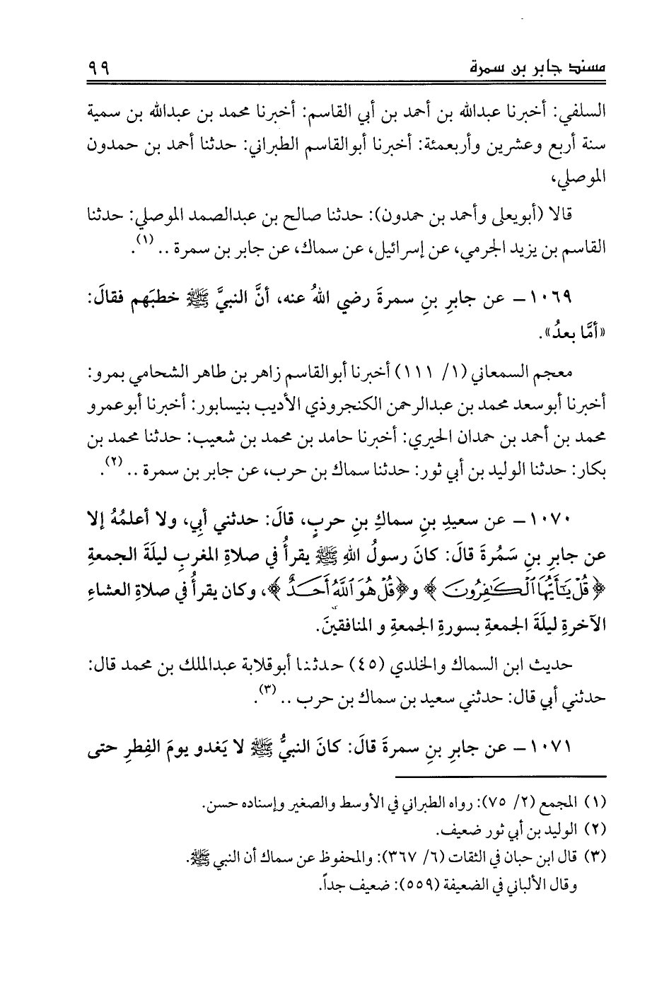 قالا (أبويعلى وأحمد بن حمدون): حدثنا صالح بن عبدالصمد الموصلي: حدثنا القاسم بن يزيد الجرمي، عن إسرائيل، عن سماك، عن جابر بن سمرة .. (¬1).