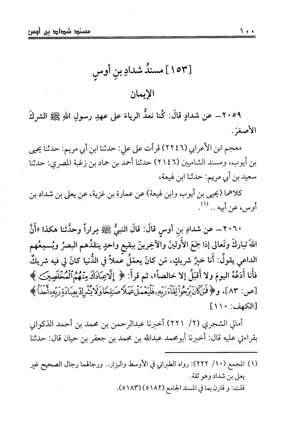 2060 - عن شدادِ بنِ أوسٍ قالَ: قالَ النبيُّ صلى الله عليه وسلم مِراراً وحدَّثنا هكذا «أَنَّ اللهَ تباركَ وتَعالى إذا جمَعَ الأَولينَ والآخِرينَ ببقيعٍ واحدٍ ينقدُهم البصرُ ويُسمِعُهم الداعي يقولُ: أَنا خيرُ شريكٍ، مَن كانَ يعمَلُ عملاً في الدُّنيا كانَ لي فيه شريكٌ فأَنا أَدَعُهُ اليومَ ولا أَقبَلُ إلا خالصاً»، ثم قرأَ: {إِلَّا عِبَادَكَ مِنْهُمُ الْمُخْلَصِينَ} [ص: 83]، و {فَمَنْ كَانَ يَرْجُو لِقَاءَ رَبِّهِ فَلْيَعْمَلْ عَمَلًا صَالِحًا وَلَا يُشْرِكْ بِعِبَادَةِ رَبِّهِ أَحَدًا} [الكهف: 110]