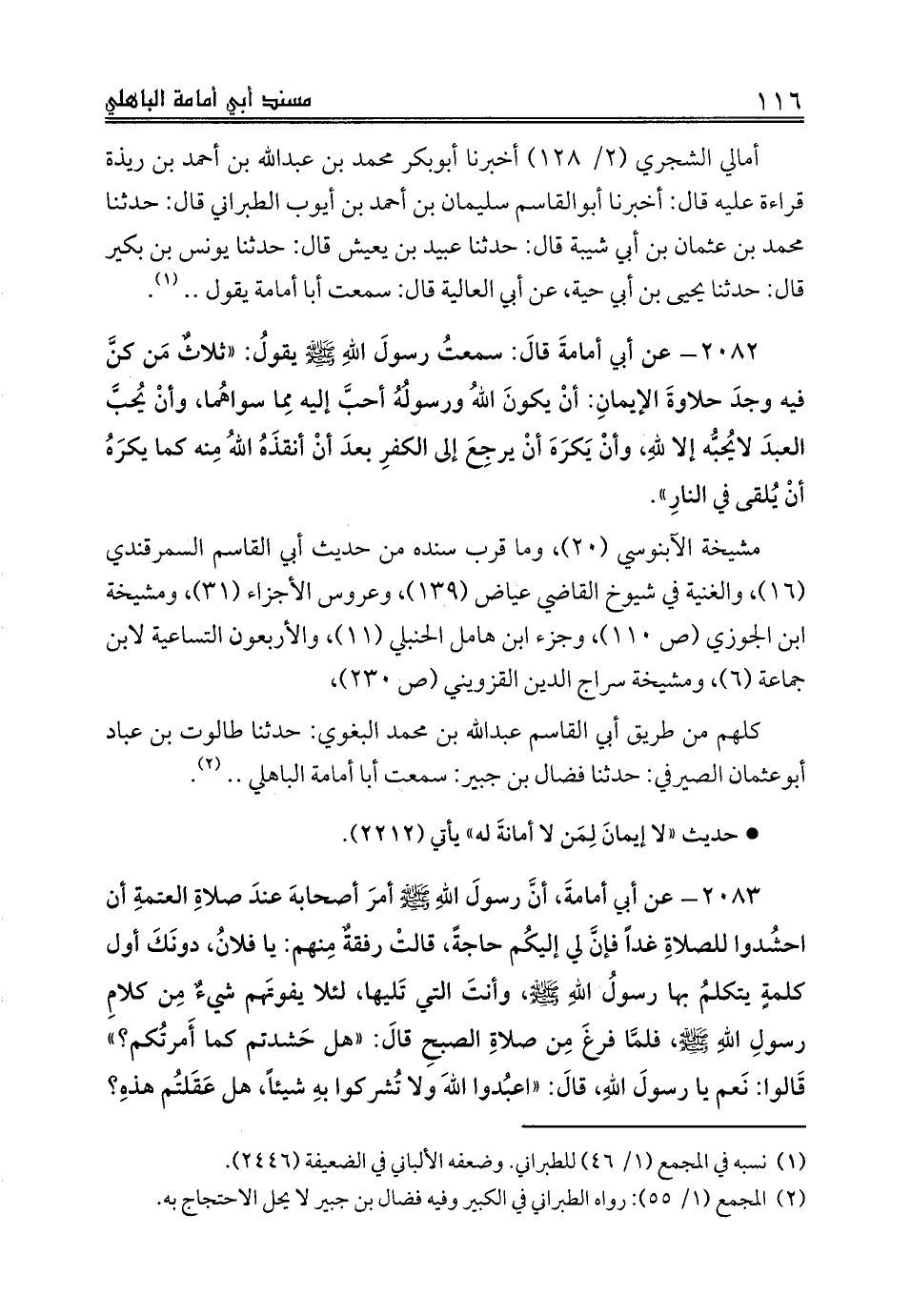 كلهم من طريق أبي القاسم عبدالله بن محمد البغوي: حدثنا طالوت بن عباد أبوعثمان الصيرفي: حدثنا فضال بن جبير: سمعت أبا أمامة الباهلي .. (¬2).