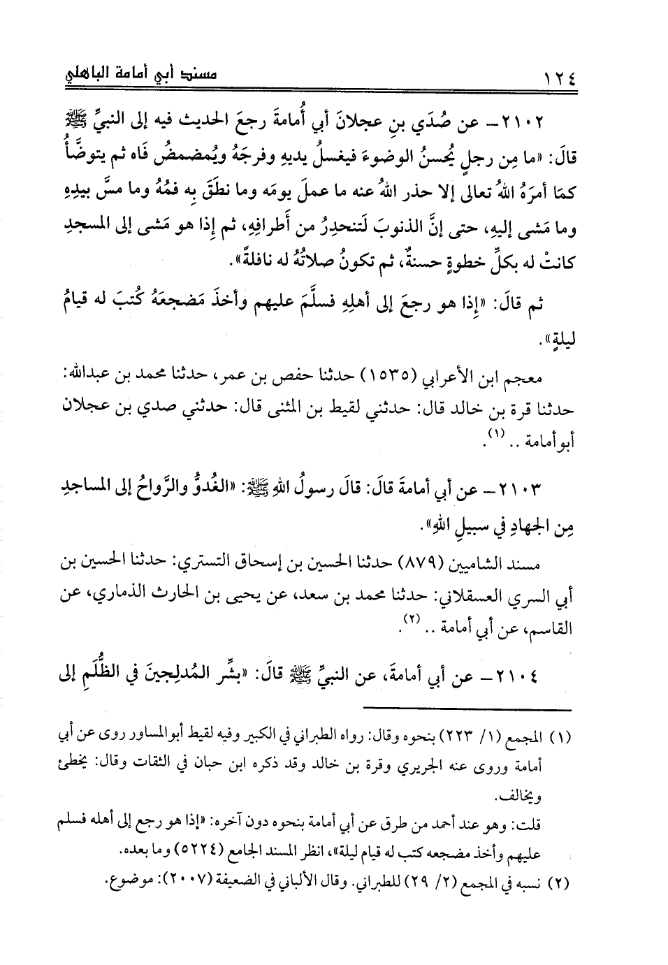 2103 - عن أبي أمامةَ قالَ: قالَ رسولُ اللهِ صلى الله عليه وسلم: «الغُدوُّ والرَّواحُ إلى المساجدِ مِن الجهادِ في سبيلِ اللهِ».