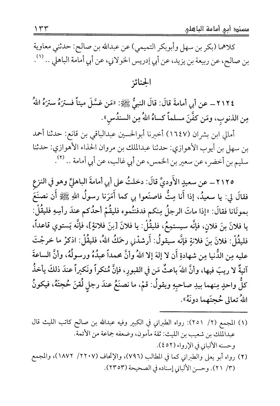 2125 - عن سعيدٍ الأَوديِّ قالَ: دخلتُ على أبي أمامةَ الباهليِّ وهو في النزعِ فقالَ لي: يا سعيدُ، إذا أَنا مِتُّ فاصنَعوا بي كما أَمَرَنا رسولُ اللهِ صلى الله عليه وسلم أَن نصنَعَ بموتَانا فقالَ: «إذا ماتَ الرجلُ مِنكم فدفنتُموه فليقُمْ أحدُكم عندَ رأسِهِ فليقُلْ: يا فلانَ بنَ فلانٍ، فإنَّه سيستمِعُ، فليقُلْ: يا فلانَ [بنَ فلانةٍ]، فإنَّه يَستوي قاعداً، فليقُلْ: فلانَ بنَ فلانةٍ فإنَّه سيقولُ: أَرشدْني رحمَكُ اللهُ، فليقُلْ: اذكرْ ما خرجْتَ عليه مِن الدُّنيا مِن شهادةِ أَن لا إلهَ إلا اللهُ وأنَّ محمداً عبدُهُ ورسولُهُ، وأنَّ الساعةَ آتيةٌ لا ريبَ فيها، وأنَّ اللهَ باعثٌ مَن في القبورِ، فإنَّ مُنكراً ونَكيراً عندَ ذلكَ يأخذُ كلُّ واحدٍ مِنهما بيدِ صاحبِهِ ويقولُ: قمْ، ما نصنَعُ عندَ رجلٍ لُقنَ حُجتَهُ، فيكونُ اللهُ تعالى حُجتَهما دونَهُ».