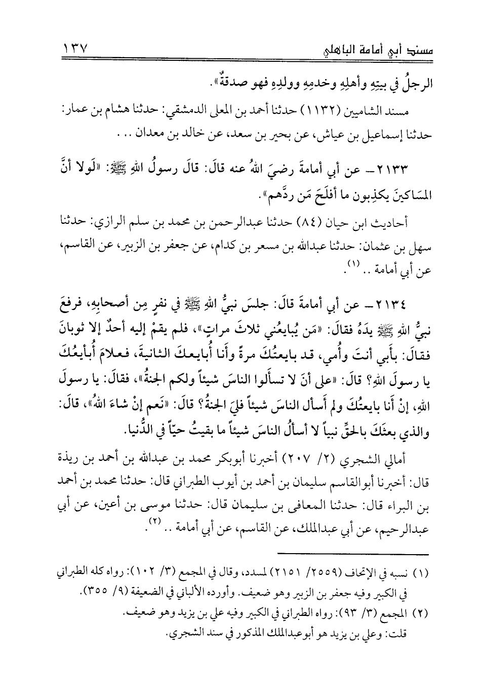 أمالي الشجري (2/ 207) أخبرنا أبوبكر محمد بن عبدالله بن أحمد بن ريذة قال: أخبرنا أبوالقاسم سليمان بن أحمد بن أيوب الطبراني قال: حدثنا محمد بن أحمد بن البراء قال: حدثنا المعافى بن سليمان قال: حدثنا موسى بن أعين، عن أبي عبدالرحيم، عن أبي عبدالملك، عن القاسم، عن أبي أمامة .. (¬2).