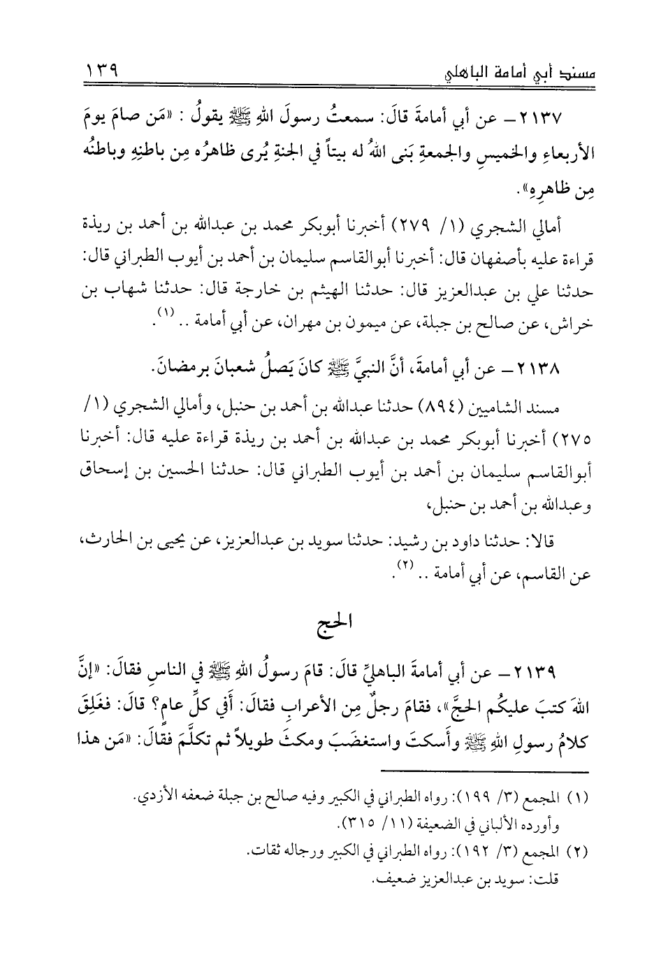 أمالي الشجري (1/ 279) أخبرنا أبوبكر محمد بن عبدالله بن أحمد بن ريذة قراءة عليه بأصفهان قال: أخبرنا أبوالقاسم سليمان بن أحمد بن أيوب الطبراني قال: حدثنا علي بن عبدالعزيز قال: حدثنا الهيثم بن خارجة قال: حدثنا شهاب بن خراش، عن صالح بن جبلة، عن ميمون بن مهران، عن أبي أمامة .. (¬1).
