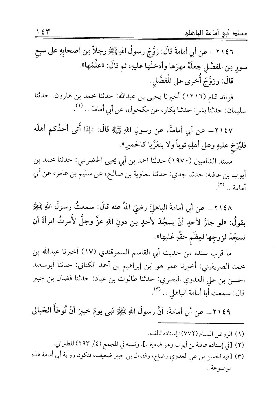 2146 - عن أبي أمامةَ قالَ: زوَّجَ رسولُ اللهِ صلى الله عليه وسلم رجلاً مِن أصحابِهِ على سبعِ سورٍ مِن المفصَّلِ جعلَهُ مهرَها وأدخلَها عليهِ، ثم قالَ: «علِّمْها».
