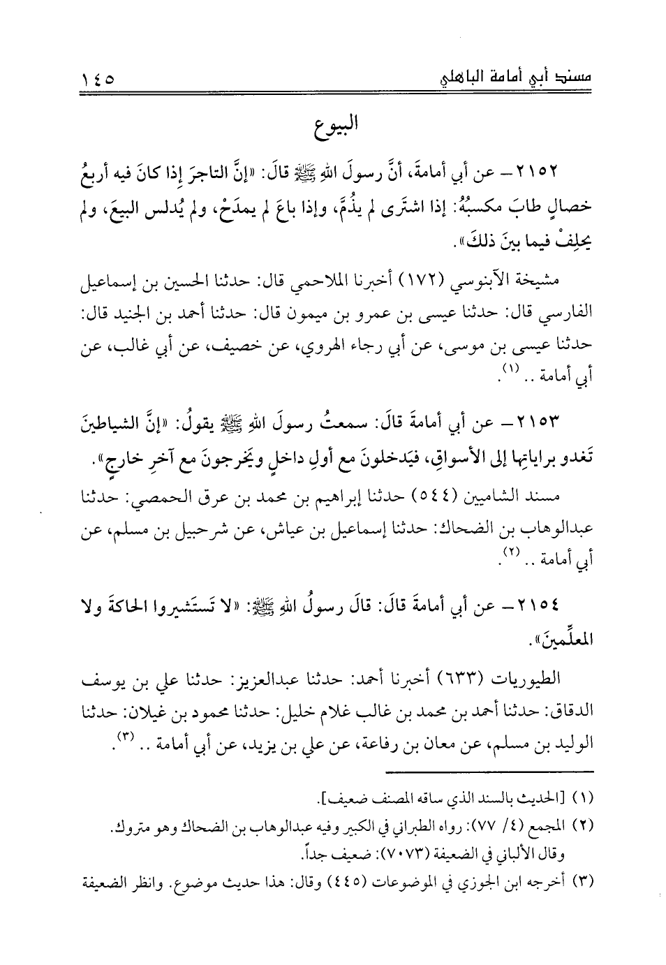 2153 - عن أبي أمامةَ قالَ: سمعتُ رسولَ اللهِ صلى الله عليه وسلم يقولُ: «إنَّ الشياطينَ تَغدو براياتِها إلى الأسواقِ، فيَدخلونَ مع أولِ داخلٍ ويَخرجونَ مع آخرِ خارجٍ».
