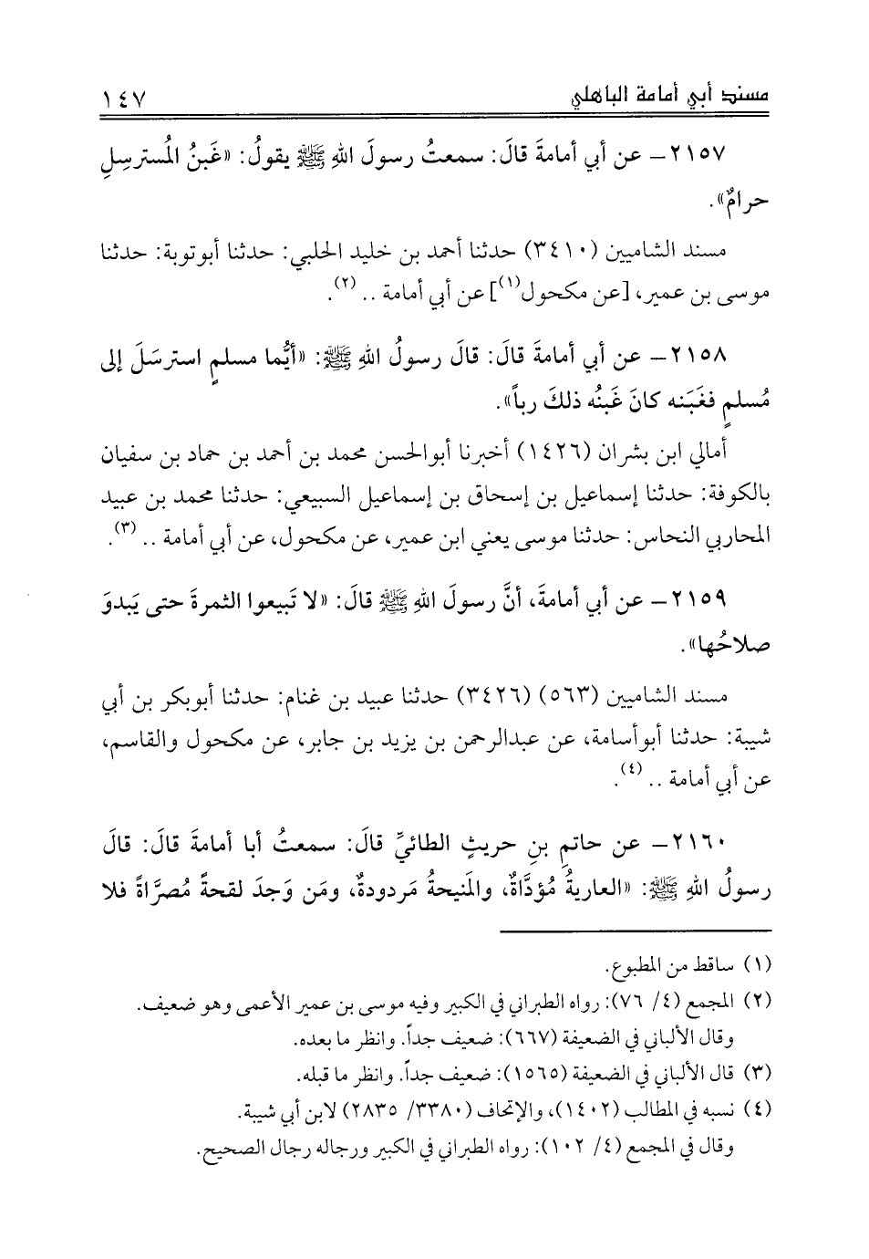 2160 - عن حاتمِ بنِ حريثٍ الطائيِّ قالَ: سمعتُ أبا أمامةَ قالَ: قالَ رسولُ اللهِ صلى الله عليه وسلم: «العاريةُ مُؤدَّاةٌ، والمَنيحةُ مَردودةٌ، ومَن وَجدَ لقحةً مُصرَّاةً فلا