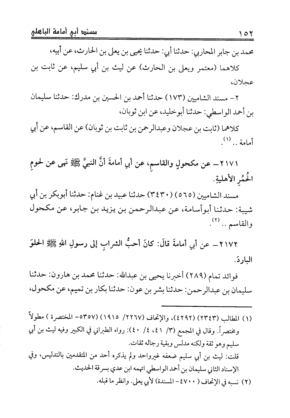 كلاهما (ثابت بن عجلان وعبدالرحمن بن ثابت بن ثوبان) عن القاسم، عن أبي أمامة .. (¬1).