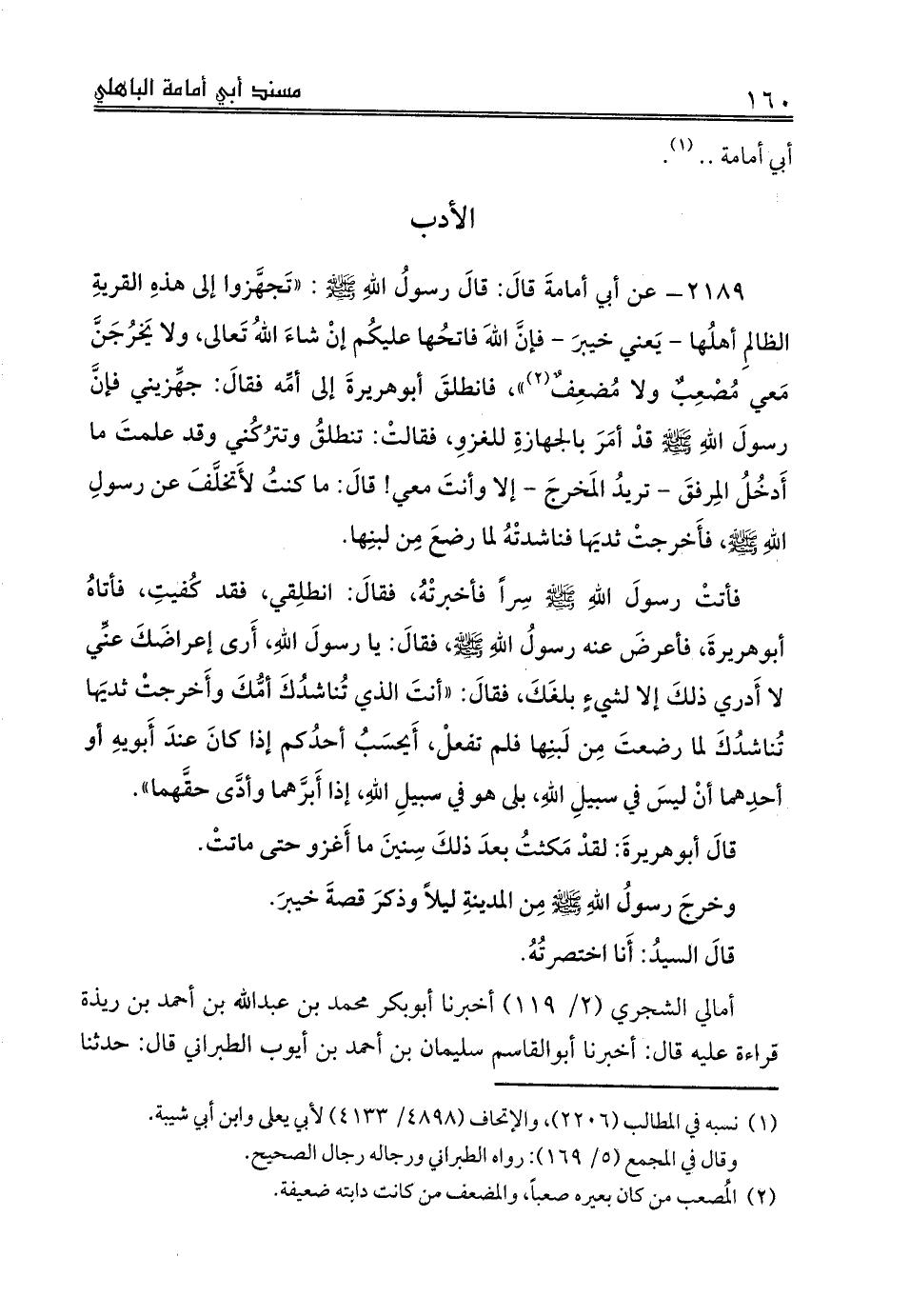 2189 - عن أبي أمامةَ قالَ: قالَ رسولُ اللهِ صلى الله عليه وسلم: «تَجهَّزوا إلى هذهِ القريةِ الظالمِ أهلُها - يَعني خيبرَ - فإنَّ اللهَ فاتحُها عليكُم إنْ شاءَ اللهُ تَعالى، ولا يَخرُجَنَّ مَعي مُصْعِبٌ ولا مُضعِفٌ (¬2)»، فانطلقَ أبوهريرةَ إلى أمِّه فقالَ: جهِّزيني فإنَّ رسولَ اللهِ صلى الله عليه وسلم قدْ أمَرَ بالجهازةِ للغزوِ، فقالتْ: تنطلقُ وتترُكُني وقد علمتَ ما أَدخُلُ المِرفقَ - تريدُ المَخرجَ - إلا وأنتَ معي! قالَ: ما كنتُ لأَتخلَّفَ عن رسولِ اللهِ صلى الله عليه وسلم، فأَخرجتْ ثديَها فناشدتْهُ لما رضعَ مِن لبنِها، فأتتْ رسولَ اللهِ صلى الله عليه وسلم سِراً فأخبرتْهُ، فقالَ: انطلِقي، فقد كُفيتِ، فأتاهُ أبوهريرةَ، فأعرضَ عنه رسولُ اللهِ صلى الله عليه وسلم، فقالَ: يا رسولَ اللهِ، أَرى إعراضَكَ عنِّي لا أَدري ذلكَ إلا لشيءٍ بلغَكَ، فقالَ: «أنتَ الذي تُناشدُكَ أمُّكَ وأَخرجتْ ثديَها تُناشدُكَ لما رضعتَ مِن لَبنِها فلم تفعلْ، أَيحسَبُ أحدُكم إذا كانَ عندَ أَبويهِ أو أحدِهما أنْ ليسَ في سبيلِ اللهِ، بلى هو في سبيلِ اللهِ، إذا أَبرَّهما وأدَّى حقَّهما».