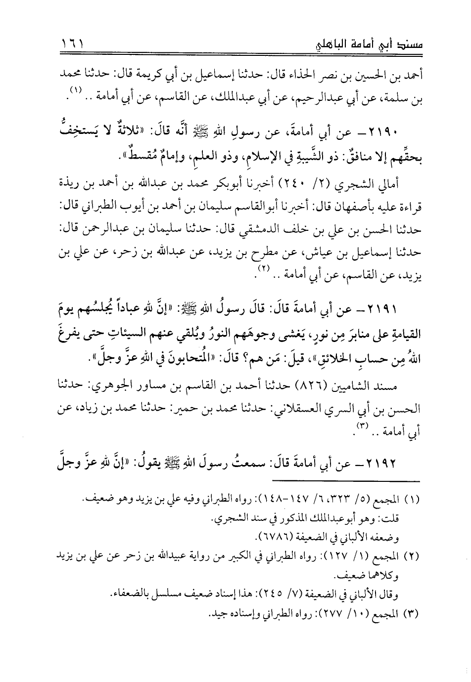 2190 - عن أبي أمامةَ، عن رسولِ اللهِ صلى الله عليه وسلم أنَّه قالَ: «ثلاثةٌ لا يَستخِفُّ بحقِّهم إلا منافقٌ: ذو الشَّيبةِ في الإسلامِ، وذو العلمِ، وإمامٌ مُقسطٌ».