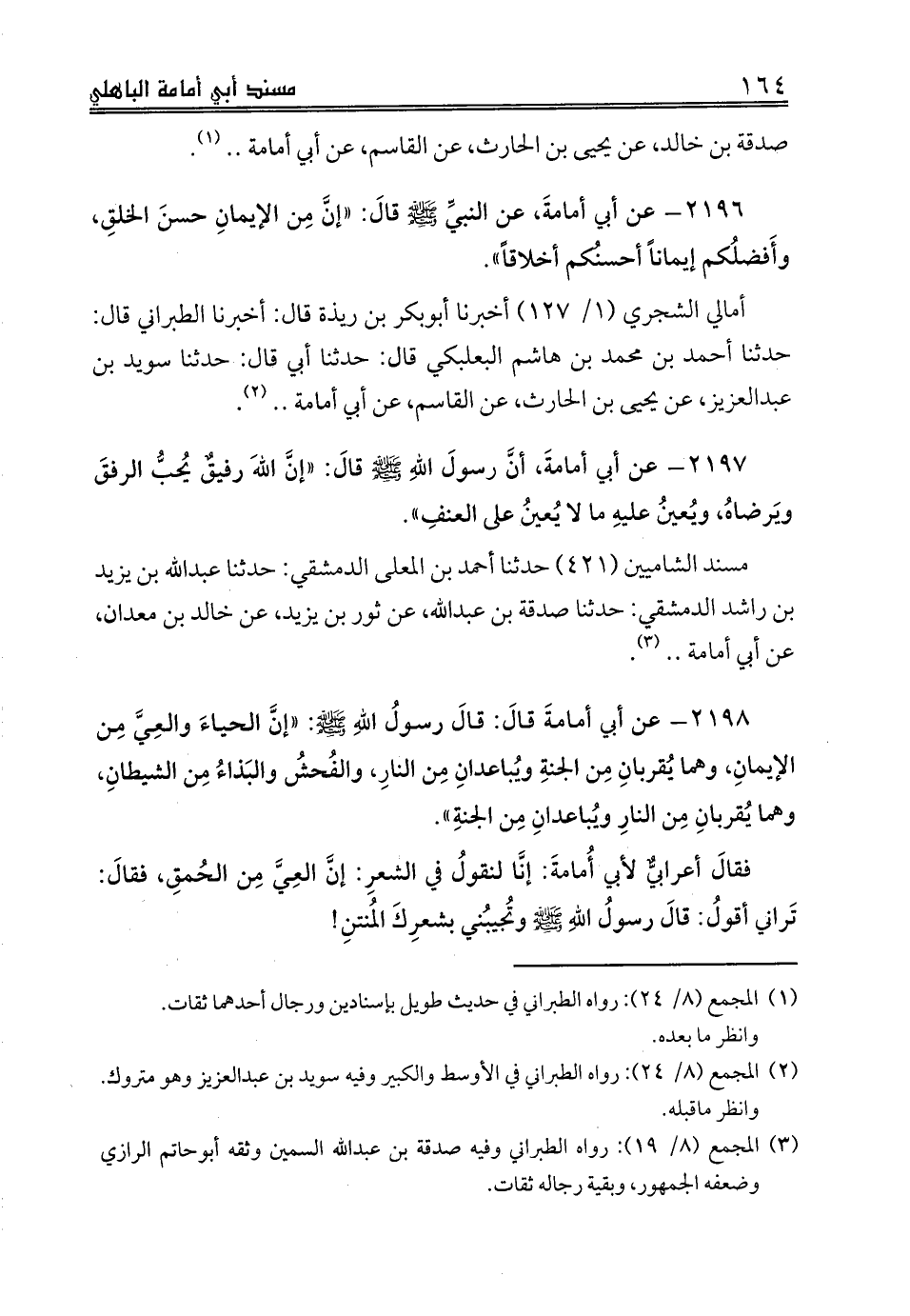 أمالي الشجري (1/ 127) أخبرنا أبوبكر بن ريذة قال: أخبرنا الطبراني قال: حدثنا أحمد بن محمد بن هاشم البعلبكي قال: حدثنا أبي قال: حدثنا سويد بن عبدالعزيز، عن يحيى بن الحارث، عن القاسم، عن أبي أمامة .. (¬2).