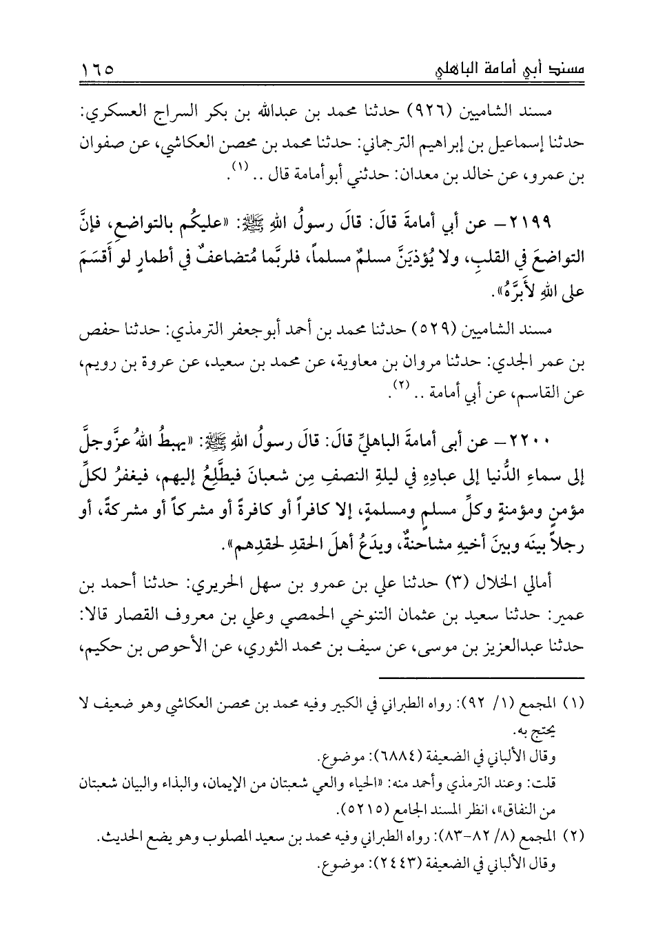 2200 - عن أبى أمامةَ الباهليِّ قالَ: قالَ رسولُ اللهِ صلى الله عليه وسلم: «يهبطُ اللهُ عزَّوجلَّ إلى سماءِ الدُّنيا إلى عبادِهِ في ليلةِ النصفِ مِن شعبانَ فيطَّلِعُ إليهم، فيغفرُ لكلِّ مؤمنٍ ومؤمنةٍ وكلِّ مسلمٍ ومسلمةٍ، إلا كافراً أو كافرةً أو مشركاً أو مشركةً، أو رجلاً بينَه وبينَ أخيهِ مشاحنةٌ، ويدَعُ أهلَ الحقدِ لحقدِهم».