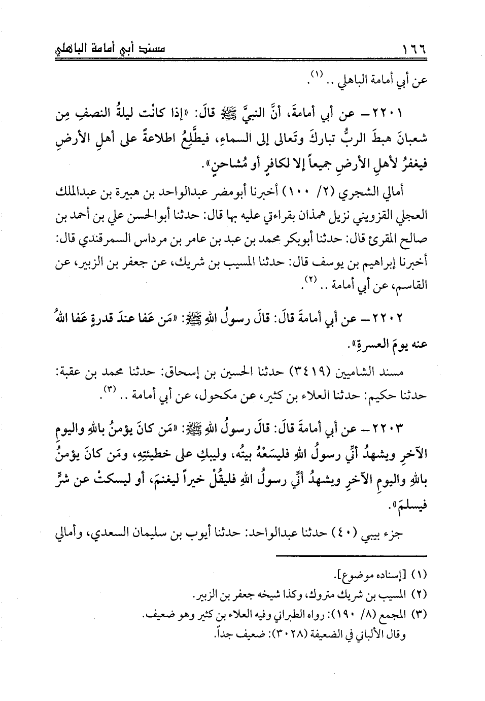 2201 - عن أبي أمامةَ، أنَّ النبيَّ صلى الله عليه وسلم قالَ: «إذا كانْت ليلةُ النصفِ مِن شعبانَ هبطَ الربُّ تباركَ وتَعالى إلى السماءِ، فيطَّلِعُ اطلاعةً على أهلِ الأرضِ فيغفرُ لأهلِ الأرضِ جميعاً إلا لكافرٍ أو مُشاحنٍ».