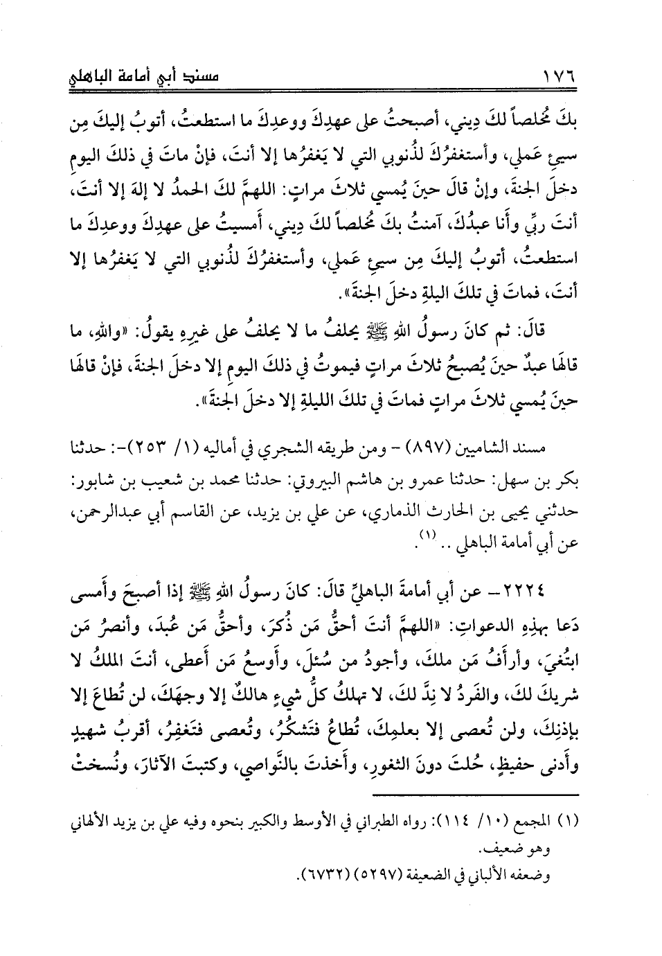 2224 - عن أبي أمامةَ الباهليِّ قالَ: كانَ رسولُ اللهِ صلى الله عليه وسلم إذا أصبحَ وأَمسى دَعا بهذِهِ الدعواتِ: «اللهمَّ أنتَ أحقُّ مَن ذُكرَ، وأحقُّ مَن عُبدَ، وأنصرُ مَن ابتُغيَ، وأرأَفُ مَن ملكَ، وأجودُ من سُئلَ، وأَوسعُ مَن أَعطى، أنتَ الملكُ لا شريكَ لكَ، والفَردُ لا نِدَّ لكَ، لا تهلكُ كلُّ شيءٍ هالكٌ إلا وجهَكَ، لن تُطاعَ إلا بإذنِكَ، ولن تُعصى إلا بعلمِكَ، تُطاعُ فتَشكُرُ، وتُعصى فتَغفِرُ، أقربُ شهيدٍ وأَدنى حفيظٍ، حُلتَ دونَ الثغورِ، وأَخذتَ بالنَّواصي، وكتبتَ الآثارَ، ونُسختْ