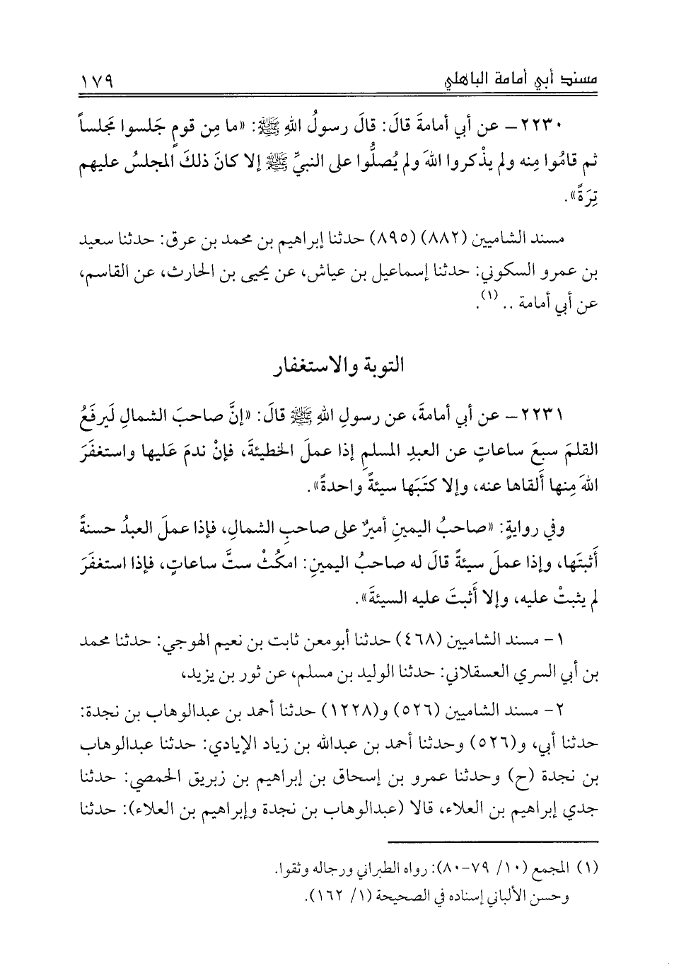 2231 - عن أبي أمامةَ، عن رسولِ اللهِ صلى الله عليه وسلم قالَ: «إنَّ صاحبَ الشمالِ لَيرفَعُ القلمَ سبعَ ساعاتٍ عن العبدِ المسلمِ إذا عملَ الخطيئةَ، فإنْ ندمَ عَليها واستغفَرَ اللهَ مِنها أَلقاها عنه، وإلا كتَبَها سيئةً واحدةً».