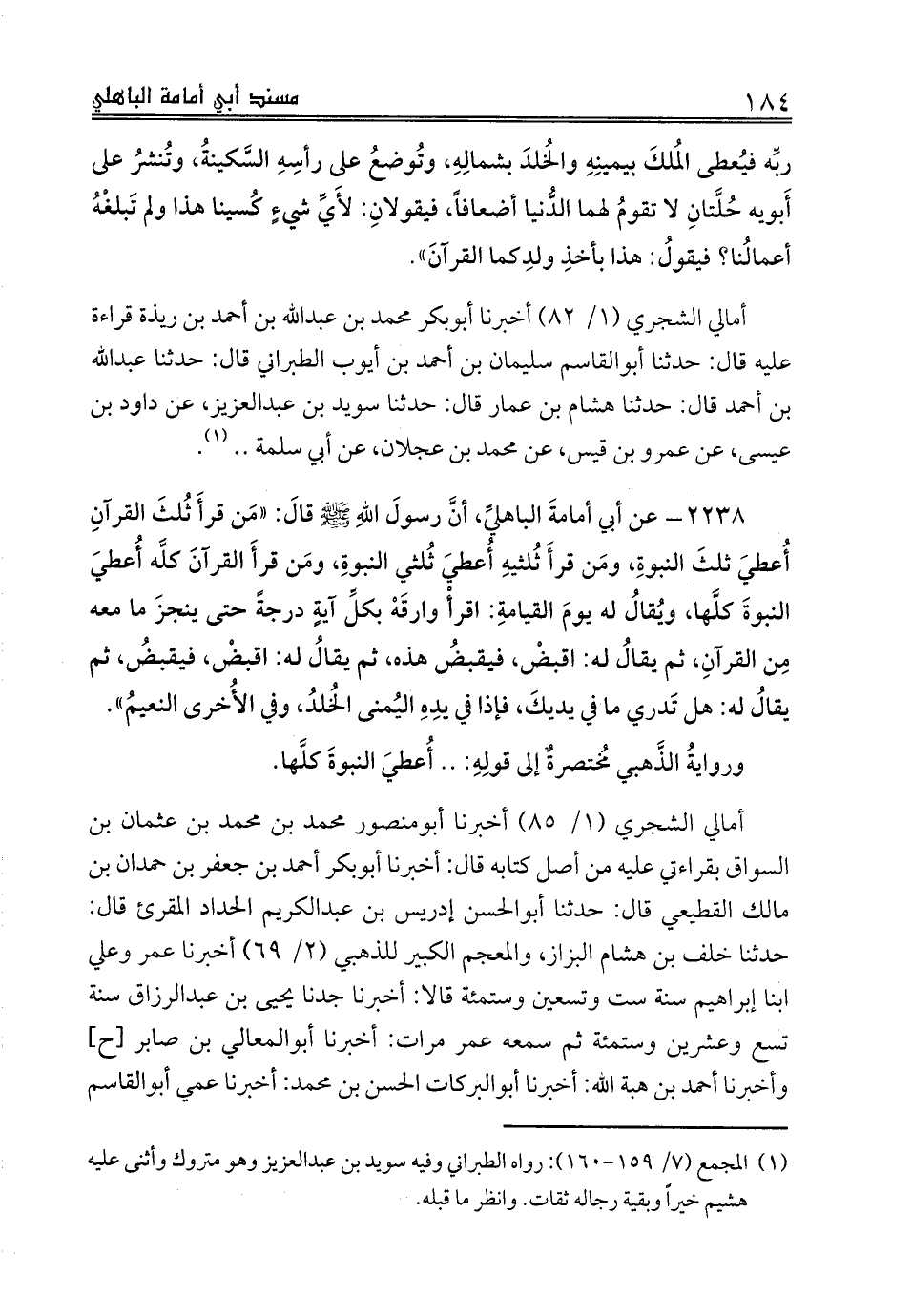 2238 - عن أبي أمامةَ الباهليِّ، أنَّ رسولَ اللهِ صلى الله عليه وسلم قالَ: «مَن قرأَ ثُلثَ القرآنِ أُعطيَ ثلثَ النبوةِ، ومَن قرأَ ثُلثيهِ أُعطيَ ثُلثي النبوةِ، ومَن قرأَ القرآنَ كلَّه أُعطيَ النبوةَ كلَّها، ويُقالُ له يومَ القيامةِ: اقرأْ وارقَهْ بكلِّ آيةٍ درجةً حتى ينجزَ ما معه مِن القرآنِ، ثم يقالُ له: اقبضْ، فيقبضُ هذه، ثم يقالُ له: اقبضْ، فيقبضُ، ثم يقالُ له: هل تَدري ما في يديكَ، فإذا في يدِهِ اليُمنى الخُلدُ، وفي الأُخرى النعيمُ».