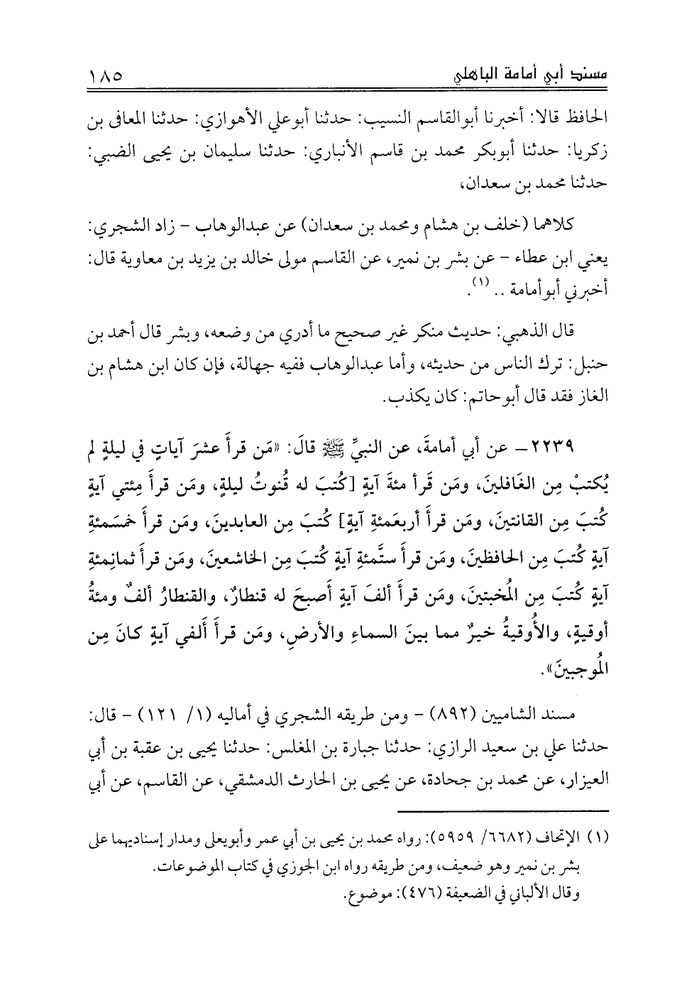 كلاهما (خلف بن هشام ومحمد بن سعدان) عن عبدالوهاب - زاد الشجري: يعني ابن عطاء - عن بشر بن نمير، عن القاسم مولى خالد بن يزيد بن معاوية قال: أخبرني أبوأمامة .. (¬1).