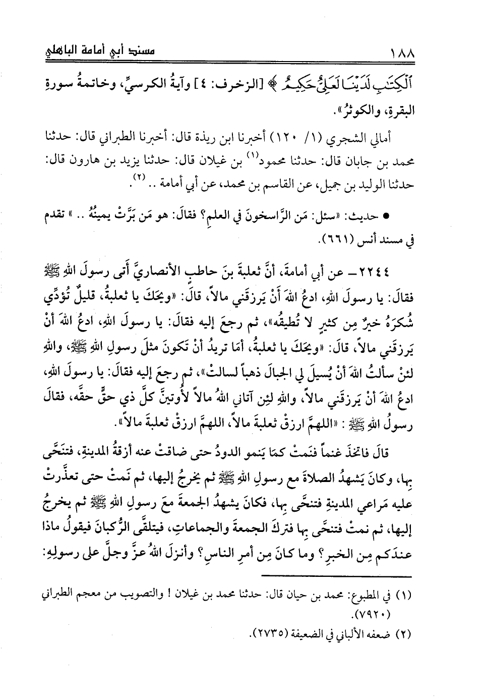 2244 - عن أبي أمامةَ، أنَّ ثعلبةَ بنَ حاطبٍ الأنصاريَّ أَتى رسولَ اللهِ صلى الله عليه وسلم فقالَ: يا رسولَ اللهِ، ادعُ اللهَ أَنْ يَرزقَني مالاً، قالَ: «ويحَكَ يا ثعلبةُ، قليلٌ تُؤدِّي شُكرَهُ خيرٌ مِن كثيرٍ لا تُطيقُه»، ثم رجعَ إليه فقالَ: يا رسولَ اللهِ، ادعُ اللهَ أنْ يَرزقَني مالاً، قالَ: «ويحَكَ يا ثعلبةُ، أمَا تريدُ أنْ تَكونَ مثلَ رسولِ اللهِ صلى الله عليه وسلم، واللهِ لئنْ سألتُ اللهَ أنْ يُسيلَ لي الجبالَ ذهباً لسالتْ»، ثم رجعَ إليه فقالَ: يا رسولَ اللهِ، ادعُ اللهَ أنْ يَرزقَني مالاً، واللهِ لئِن آتاني اللهُ مالاً لأُوتينَّ كلَّ ذي حقٍّ حقَّه، فقالَ رسولُ اللهِ صلى الله عليه وسلم: «اللهمَّ ارزقْ ثعلبةَ مالاً، اللهمَّ ارزقْ ثعلبةَ مالاً».