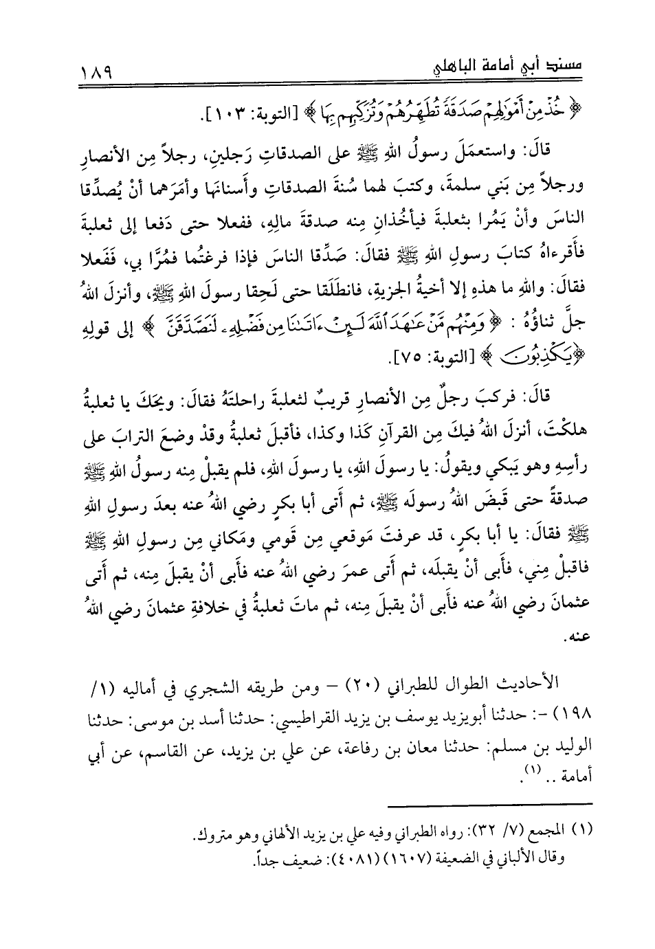 قالَ: واستعمَلَ رسولُ اللهِ صلى الله عليه وسلم على الصدقاتِ رَجلينِ، رجلاً مِن الأنصارِ ورجلاً مِن بَني سلمةَ، وكتبَ لهما سُنةَ الصدقاتِ وأَسنانَها وأمَرَهما أنْ يُصدِّقا الناسَ وأنْ يَمُرا بثعلبةَ فيأخُذانِ مِنه صدقةَ مالِهِ، ففعلا حتى دَفعا إلى ثعلبةَ فأَقرءاهُ كتابَ رسولِ اللهِ صلى الله عليه وسلم فقالَ: صَدِّقا الناسَ فإذا فرغتُما فمُرَّا بي، فَفَعلا فقالَ: واللهِ ما هذهِ إلا أخيةُ الجزيةِ، فانطَلَقا حتى لَحِقا رسولَ اللهِ صلى الله عليه وسلم، وأنزلَ اللهُ جلَّ ثناؤُهُ: {وَمِنْهُمْ مَنْ عَاهَدَ اللَّهَ لَئِنْ آتَانَا مِنْ فَضْلِهِ لَنَصَّدَّقَنَّ} إلى قولِهِ {يَكْذِبُونَ} [التوبة: 75].