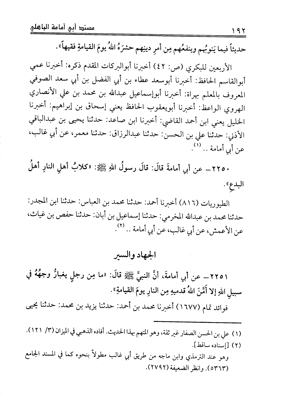 الأربعين للبكري (ص: 42) أخبرنا أبوالبركات المقدم ذكره: أخبرنا عمي أبوالقاسم الحافظ: أخبرنا أبوسعد عطاء بن أبي الفضل بن أبي سعد الصوفي المعروف بالمعلم بهراة: أخبرنا أبوإسماعيل عبدالله بن محمد بن علي الأنصاري الهروي الواعظ: أخبرنا أبويعقوب الحافظ يعني إسحاق بن إبراهيم: أخبرنا الخليل يعني ابن أحمد القاضي: أخبرنا ابن صاعد: حدثنا يحيى بن عبدالباقي الأذني: حدثنا علي بن الحسن: حدثنا عبدالرزاق: حدثنا معمر، عن أبي غالب، عن أبي أمامة .. (¬1).