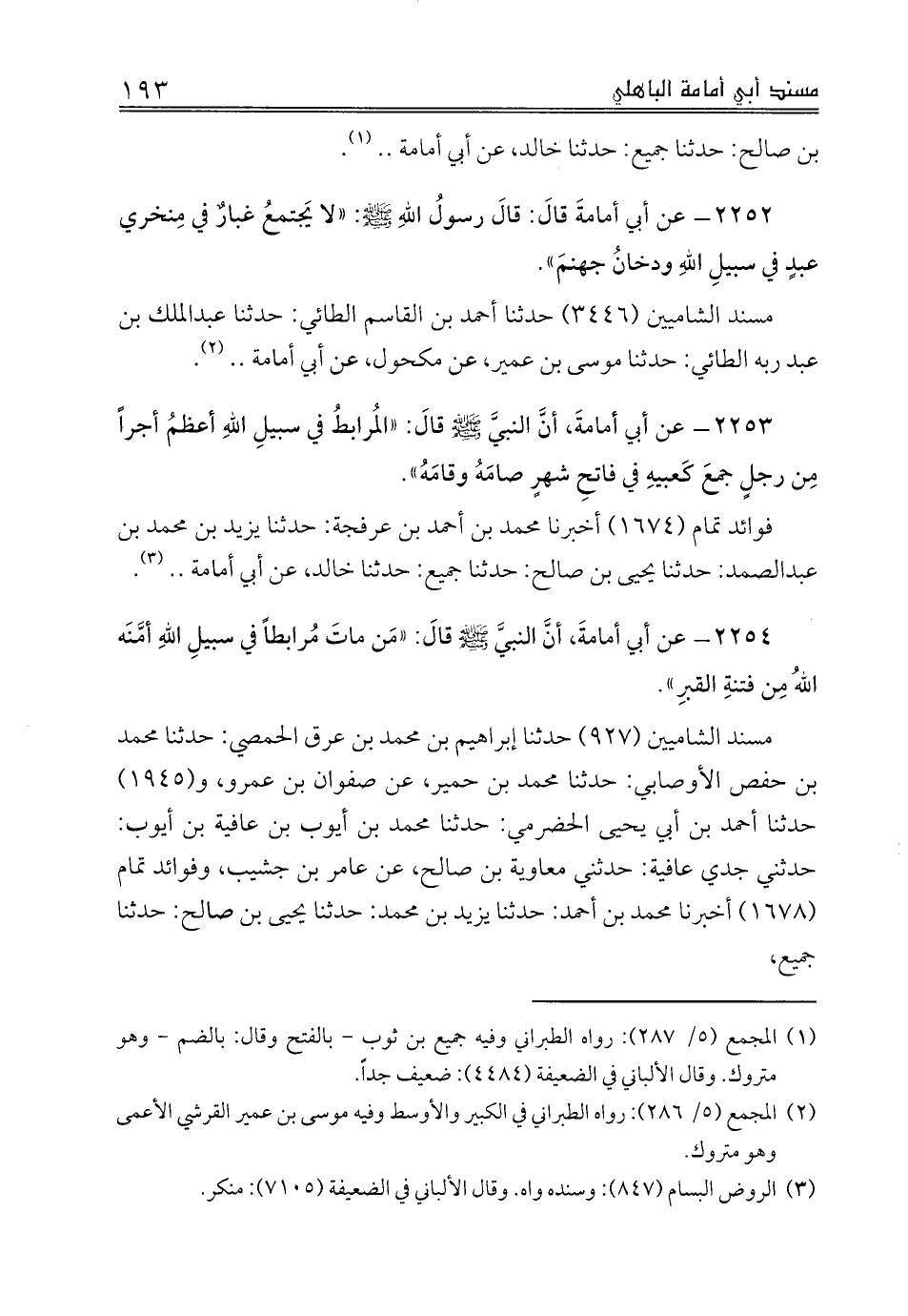 مسند الشاميين (927) حدثنا إبراهيم بن محمد بن عرق الحمصي: حدثنا محمد بن حفص الأوصابي: حدثنا محمد بن حمير، عن صفوان بن عمرو، و (1945) حدثنا أحمد بن أبي يحيى الحضرمي: حدثنا محمد بن أيوب بن عافية بن أيوب: حدثني جدي عافية: حدثني معاوية بن صالح، عن عامر بن جشيب، وفوائد تمام (1678) أخبرنا محمد بن أحمد: حدثنا يزيد بن محمد: حدثنا يحيى بن صالح: حدثنا جميع،