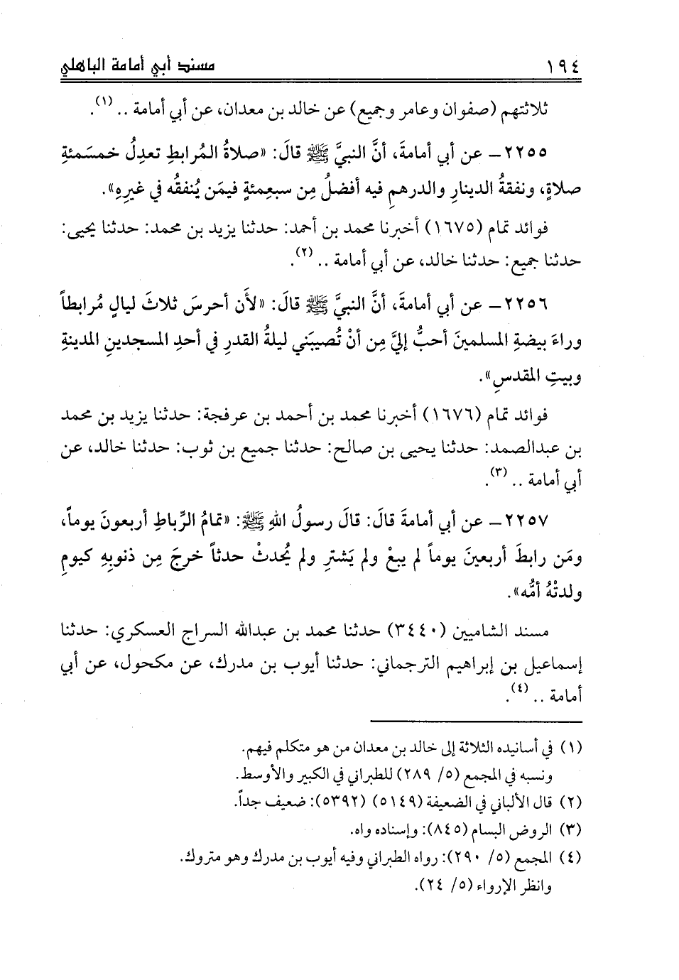ثلاثتهم (صفوان وعامر وجميع) عن خالد بن معدان، عن أبي أمامة .. (¬1).
