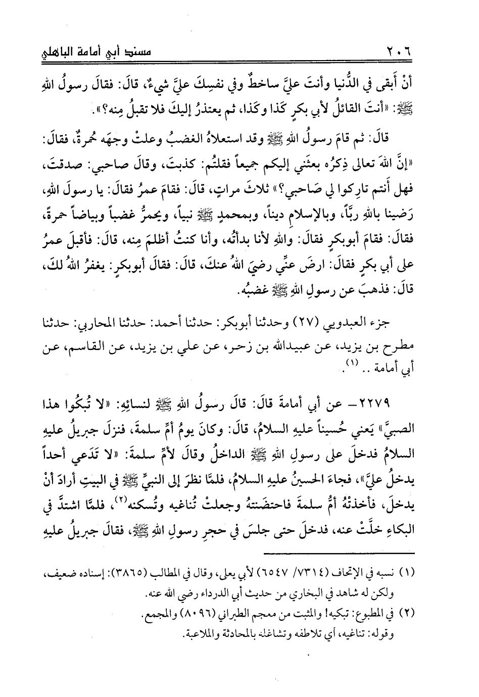 2279 - عن أبي أمامةَ قالَ: قالَ رسولُ اللهِ صلى الله عليه وسلم لنسائِهِ: «لا تُبكُوا هذا الصبيَّ» يَعني حُسيناً عليهِ السلامُ، قالَ: وكانَ يومُ أمِّ سلمةَ، فنزلَ جبريلُ عليهِ السلامُ فدخلَ على رسولِ اللهِ صلى الله عليه وسلم الداخلُ وقالَ لأمِّ سلمةَ: «لا تَدَعي أحداً يدخلُ عليَّ»، فجاءَ الحسينُ عليهِ السلامُ، فلمَّا نظرَ إلى النبيِّ صلى الله عليه وسلم في البيتِ أرادَ أنْ يدخلَ، فأخذتْهُ أمُّ سلمةَ فاحتضَنتهُ وجعلتْ تُناغيه وتُسكنه (¬2)، فلمَّا اشتدَّ في البكاءِ خلَّتْ عنه، فدخلَ حتى جلسَ في حجرِ رسولِ اللهِ صلى الله عليه وسلم، فقالَ جبريلُ عليهِ