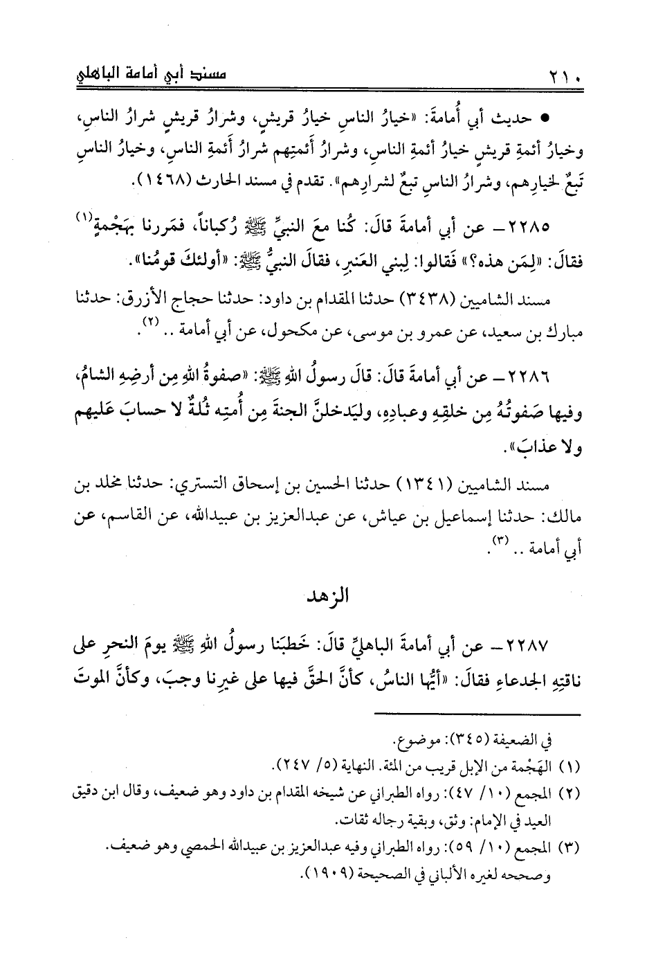 * حديث أبي أُمامةَ: «خيارُ الناسِ خيارُ قريشٍ، وشرارُ قريشٍ شرارُ الناسِ، وخيارُ أئمةِ قريشٍ خيارُ أئمةِ الناسِ، وشرارُ أَئمتِهم شرارُ أَئمةِ الناسِ، وخيارُ الناسِ تَبعٌ لخيارِهم، وشرارُ الناسِ تبعٌ لشرارِهم». تقدم في مسند الحارث (1468).