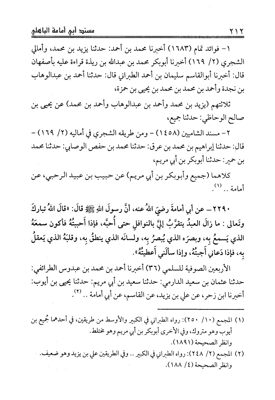2290 - عن أبي أمامةَ رضيَ اللهُ عنه، أنَّ رسولَ اللهِ صلى الله عليه وسلم قالَ: «قالَ اللهُ تباركَ وتَعالى: ما زالَ العبدُ يتقرَّبُ إليَّ بالنوافلِ حتى أُحبَّه، فإذا أَحببتُهُ فأكون سمعَهُ الذي يَسمعُ بِه، وبصرَه الذي يُبصرُ بِه، ولسانَه الذي ينطقُ بِه، وقلبَهُ الذي يَعقلُ بِه، فإذا دَعاني أَجبتُهُ، وإذا سألَني أَعطيتُهُ».