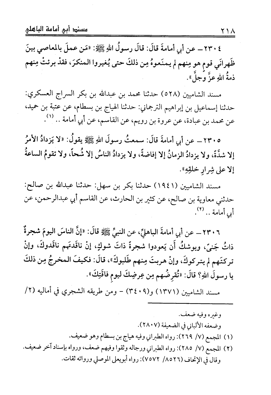 2305 - عن أبي أمامةَ قالَ: سمعتُ رسولَ اللهِ صلى الله عليه وسلم يقولُ: «لا يَزدادُ الأمرُ إلا شدَّةً، ولا يزدادُ الزمانُ إلا إفاضةً، ولا يزدادُ الناسُ إلا شُحاً، ولا تقومُ الساعةُ إلا على شِرارِ خلقِهِ».