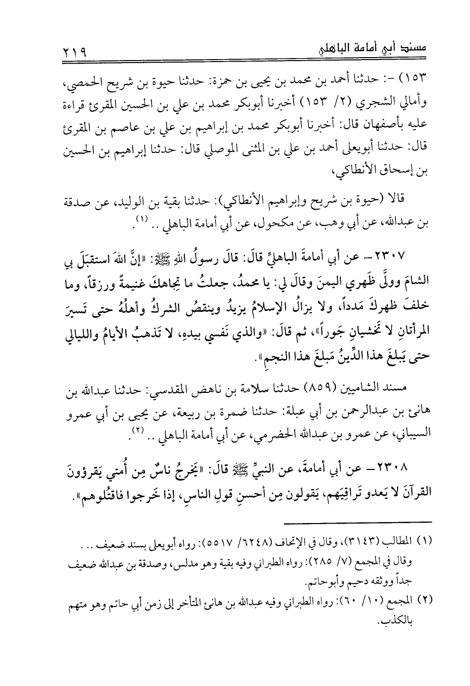 قالا (حيوة بن شريح وإبراهيم الأنطاكي): حدثنا بقية بن الوليد، عن صدقة بن عبدالله، عن أبي وهب، عن مكحول، عن أبي أمامة الباهلي .. (¬1).