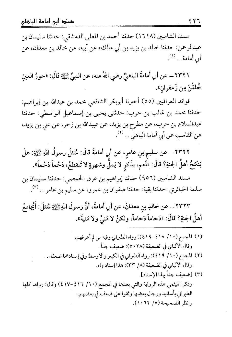 2323 - عن خالدِ بنِ معدانَ، عن أبي أمامةَ، أنَّ رسولَ اللهِ صلى الله عليه وسلم سُئلَ: أَيُجامعُ أهلُ الجنةِ؟ قالَ: «دَحاماً دَحاماً، ولكنْ لا مَنيَّ ولا مَنيةَ».