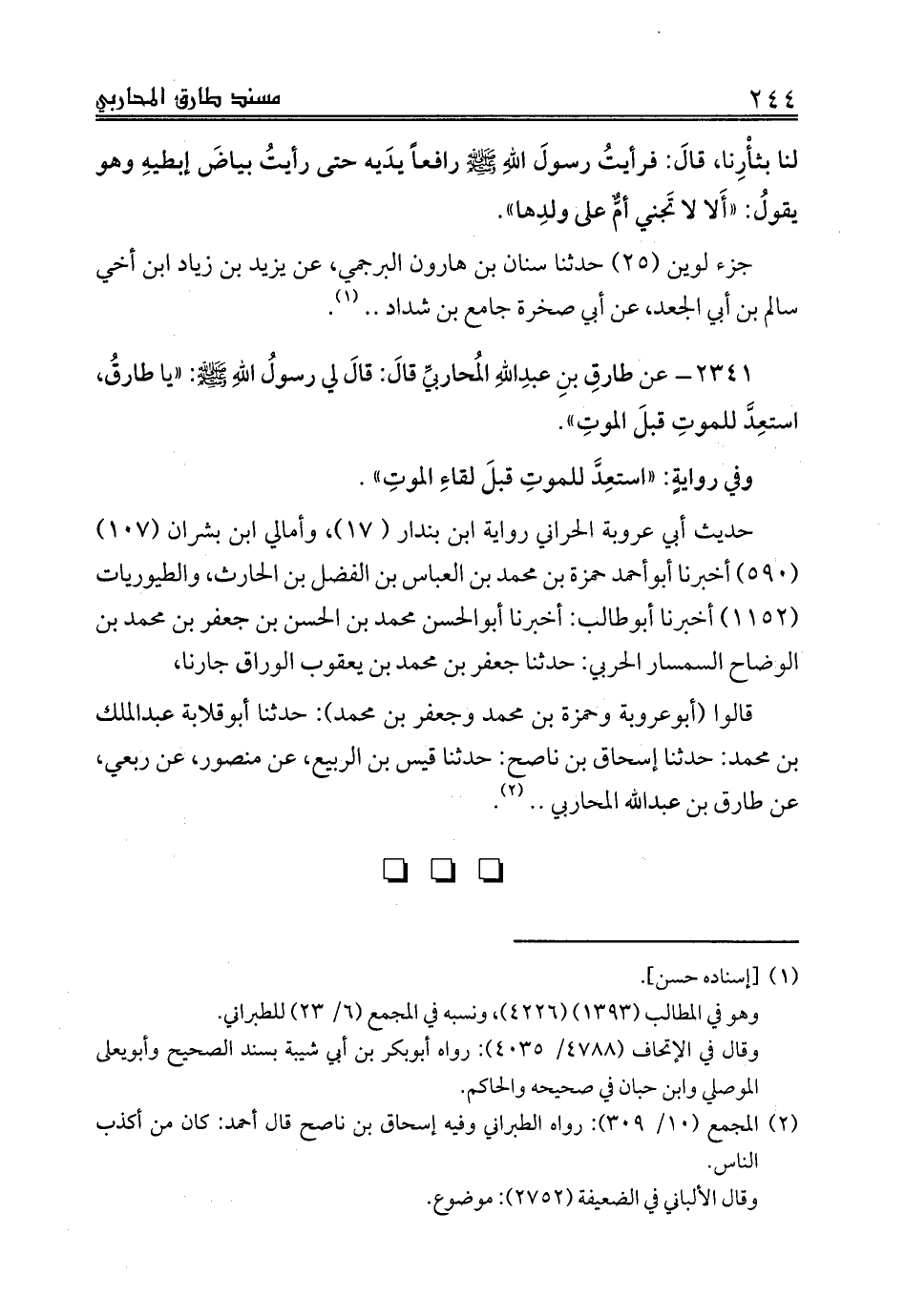 2341 - عن طارقِ بنِ عبدِاللهِ المُحاربيِّ قالَ: قالَ لي رسولُ اللهِ صلى الله عليه وسلم: «يا طارقُ، استعِدَّ للموتِ قبلَ الموتِ».