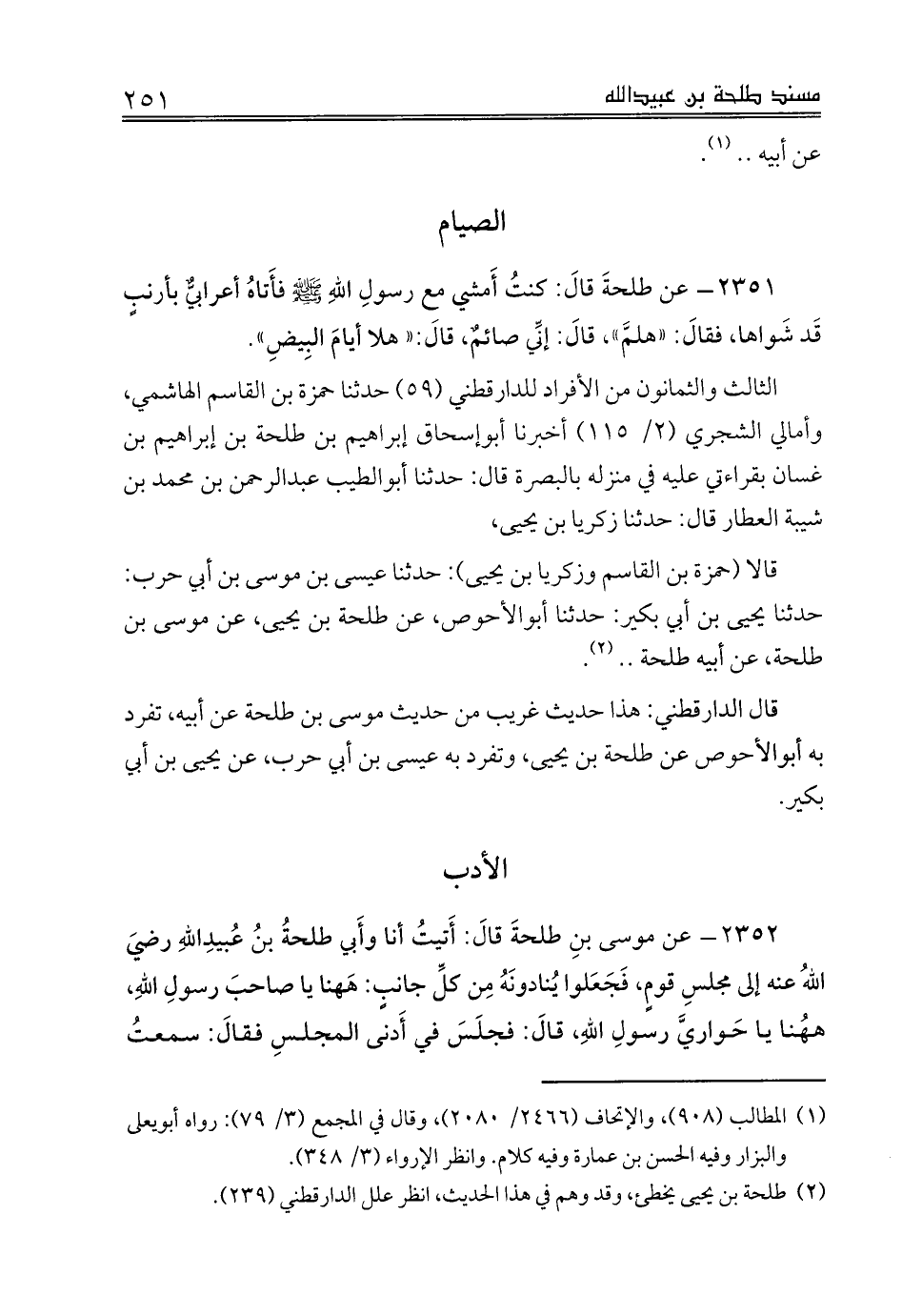 قالا (حمزة بن القاسم وزكريا بن يحيى): حدثنا عيسى بن موسى بن أبي حرب: حدثنا يحيى بن أبي بكير: حدثنا أبوالأحوص، عن طلحة بن يحيى، عن موسى بن طلحة، عن أبيه طلحة .. (¬2).