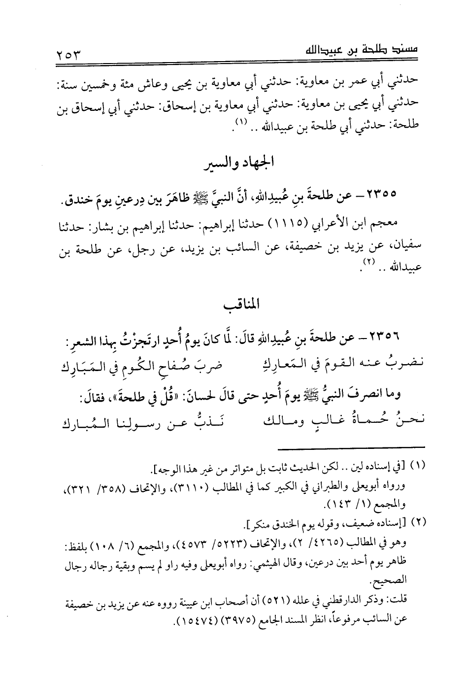 وما انصرفَ النبيُّ صلى الله عليه وسلم يومَ أُحدٍ حتى قالَ لحسانَ: «قُلْ في طلحةَ»، فقالَ: