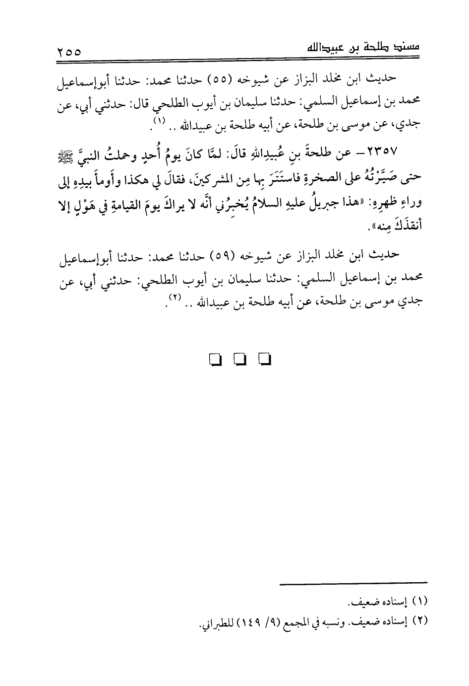 حديث ابن مخلد البزاز عن شيوخه (55) حدثنا محمد: حدثنا أبوإسماعيل محمد بن إسماعيل السلمي: حدثنا سليمان بن أيوب الطلحي قال: حدثني أبي، عن جدي، عن موسى بن طلحة، عن أبيه طلحة بن عبيدالله .. (¬1).