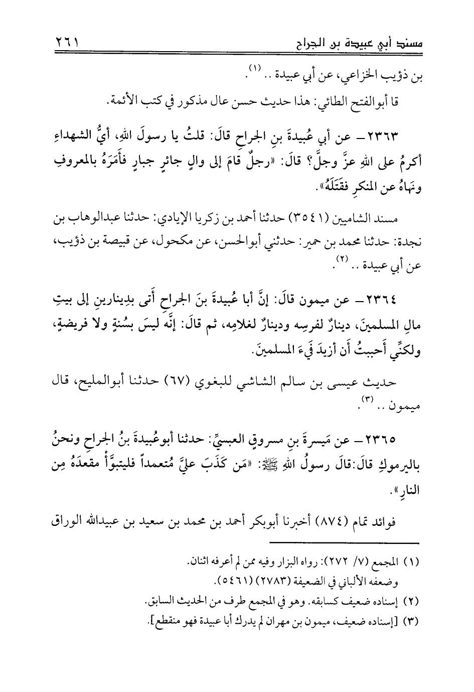 2363 - عن أبي عُبيدةَ بنٍ الجراحِ قالَ: قلتُ يا رسولُ اللهِ، أيُّ الشهداءِ أكرمُ على اللهِ عزَّ وجلَّ؟ قالَ: «رجلٌ قامَ إلى والٍ جائرٍ جبارٍ فأَمَرَهُ بالمعروفِ ونَهاهُ عن المنكرِ فقَتَلَهُ».