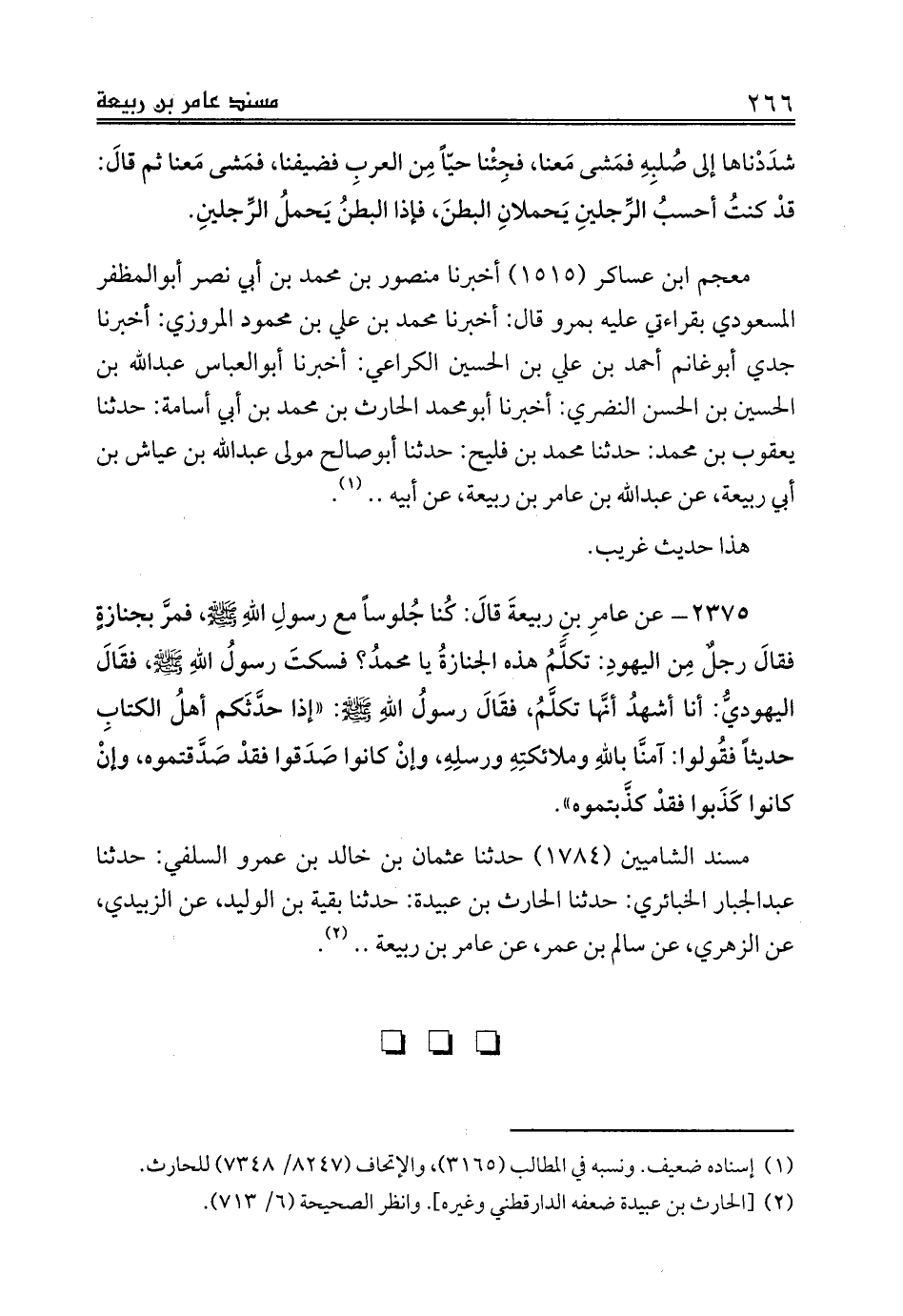 2375 - عن عامرِ بنِ ربيعةَ قالَ: كُنا جُلوساً مع رسولِ اللهِ صلى الله عليه وسلم، فمرَّ بجنازةٍ فقالَ رجلٌ مِن اليهودِ: تكلَّمُ هذه الجنازةُ يا محمدُ؟ فسكتَ رسولُ اللهِ صلى الله عليه وسلم، فقَالَ اليهوديُّ: أنا أشهدُ أنَّها تكلَّمُ، فقَالَ رسولُ اللهِ صلى الله عليه وسلم: «إذا حدَّثَكم أهلُ الكتابِ حديثاً فقُولوا: آمنَّا باللهِ وملائكتِهِ ورسلِهِ، وإنْ كانوا صَدَقوا فقدْ صَدَّقتموه، وإنْ كانوا كَذَبوا فقدْ كذَّبتموه».