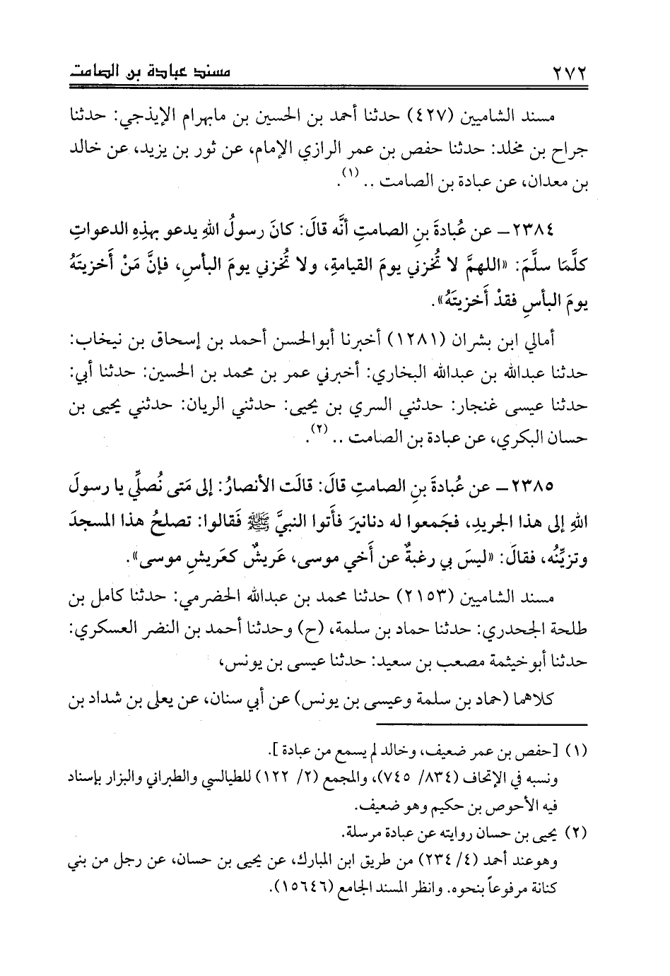 مسند الشاميين (427) حدثنا أحمد بن الحسين بن مابهرام الإيذجي: حدثنا جراح بن مخلد: حدثنا حفص بن عمر الرازي الإمام، عن ثور بن يزيد، عن خالد بن معدان، عن عبادة بن الصامت .. (¬1).