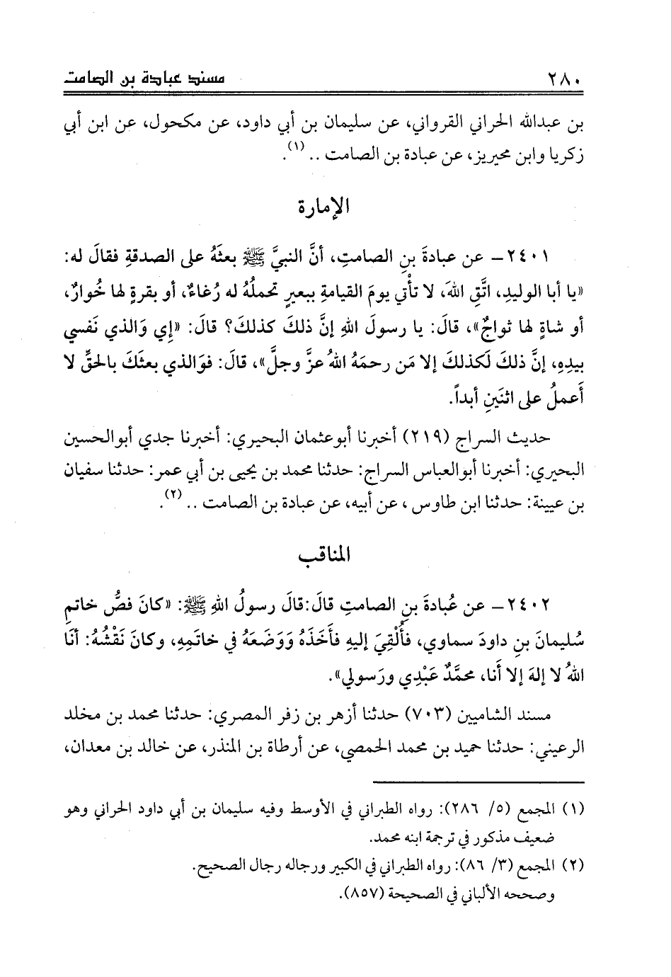 2401 - عن عبادةَ بنِ الصامتِ، أنَّ النبيَّ صلى الله عليه وسلم بعثَهُ على الصدقةِ فقالَ له: «يا أبا الوليدِ، اتَّقِ اللهَ، لا تأْتي يومَ القيامةِ ببعيرٍ تحملُهُ له رُغاءٌ، أو بقرةٍ لها خُوارٌ، أو شاةٍ لها ثواجٌ»، قالَ: يا رسولَ اللهِ إنَّ ذلكَ كذلكَ؟ قالَ: «إِي وَالذي نَفسي بيدِهِ، إنَّ ذلكَ لَكذلكَ إلا مَن رحمَهُ اللهُ عزَّ وجلَّ»، قالَ: فوَالذي بعثَكَ بالحقِّ لا أَعملُ على اثنَينِ أبداً.