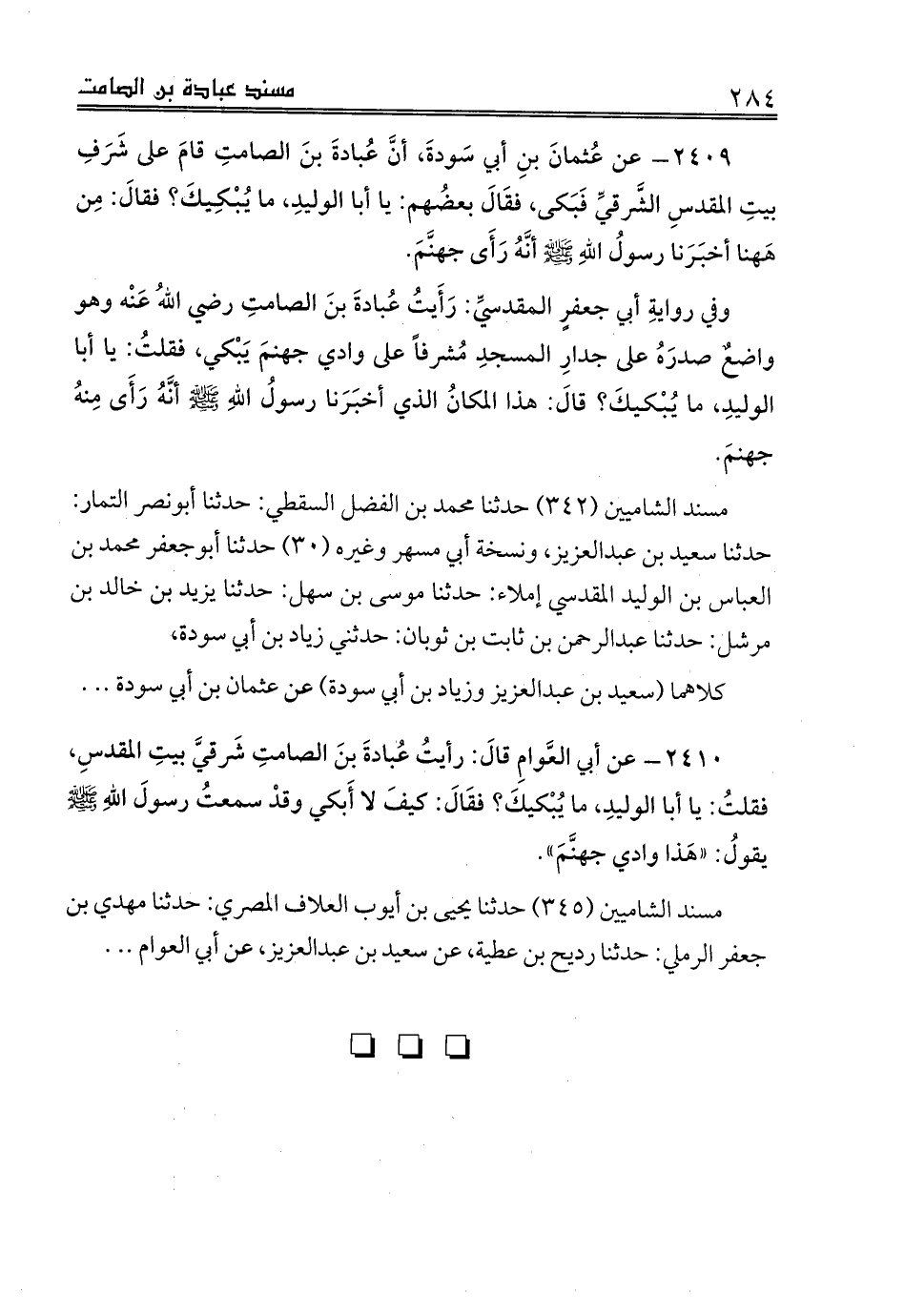 2410 - عن أبي العَّوامِ قالَ: رأيتُ عُبادةَ بنَ الصامتِ شَرقيَّ بيتِ المقدسِ، فقلتُ: يا أبا الوليدِ، ما يُبْكيكَ؟ فقَالَ: كيفَ لا أَبكي وقدْ سمعتُ رسولَ اللهِ صلى الله عليه وسلم يقولُ: «هَذا وادي جهنَّمَ».