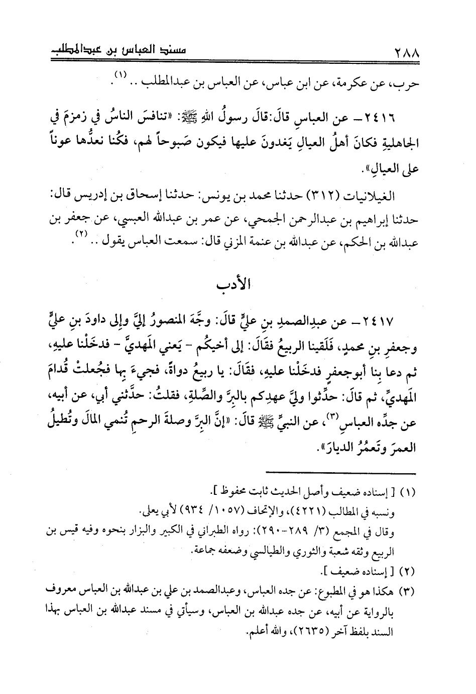 2417 - عن عبدِالصمدِ بنِ عليٍّ قالَ: وجَّهَ المنصورُ إليَّ وإِلى داودَ بنِ عليٍّ وجعفرِ بنِ محمدٍ، فَلَقينا الربيعُ فقَالَ: إلى أخيكُم - يَعني المَهديَّ - فدخَلْنا عليهِ، ثم دعا بِنا أبوجعفرٍ فدخَلْنا عليهِ، فقَالَ: يا ربيعُ دواةً، فجيءَ بِها فجُعلتْ قُدامَ المَهديَّ، ثم قالَ: حدِّثوا وليَّ عهدِكم بالبِرَّ والصِّلةِ، فقلتُ: حدَّثني أبي، عن أبيه، عن جدِّه العباسِ (¬3)، عن النبيِّ صلى الله عليه وسلم قالَ: «إنَّ البِرَّ وصلةَ الرحمِ تُنمي المالَ وتُطيلُ العمرَ وتَعمُرُ الديارَ».
