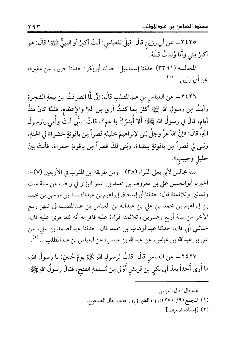 2425 - عن أبي رزينٍ قالَ: قيلَ للعباسِ: أنتَ أكبرُ أو النبيُّ صلى الله عليه وسلم؟ قالَ: هو أكبرُ مِني وأَنا وُلدتُ قبلَهُ.