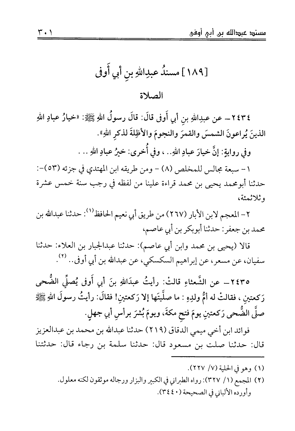 2435 - عن الشَّعثاءِ قالتْ: رأيتُ عبدَاللهِ بنَ أبي أَوفى يُصلِّي الضُّحى رَكعتينِ، فقالتْ له أمُّ ولدِهِ: ما صلَّيتَها إلا رَكعتينِ! فقالَ: رأيتُ رسولَ اللهِ صلى الله عليه وسلم صلَّى الضُّحى رَكعتينِ يومَ فتحِ مكةَ، ويومَ بُشرَ برأسِ أبي جهلٍ.