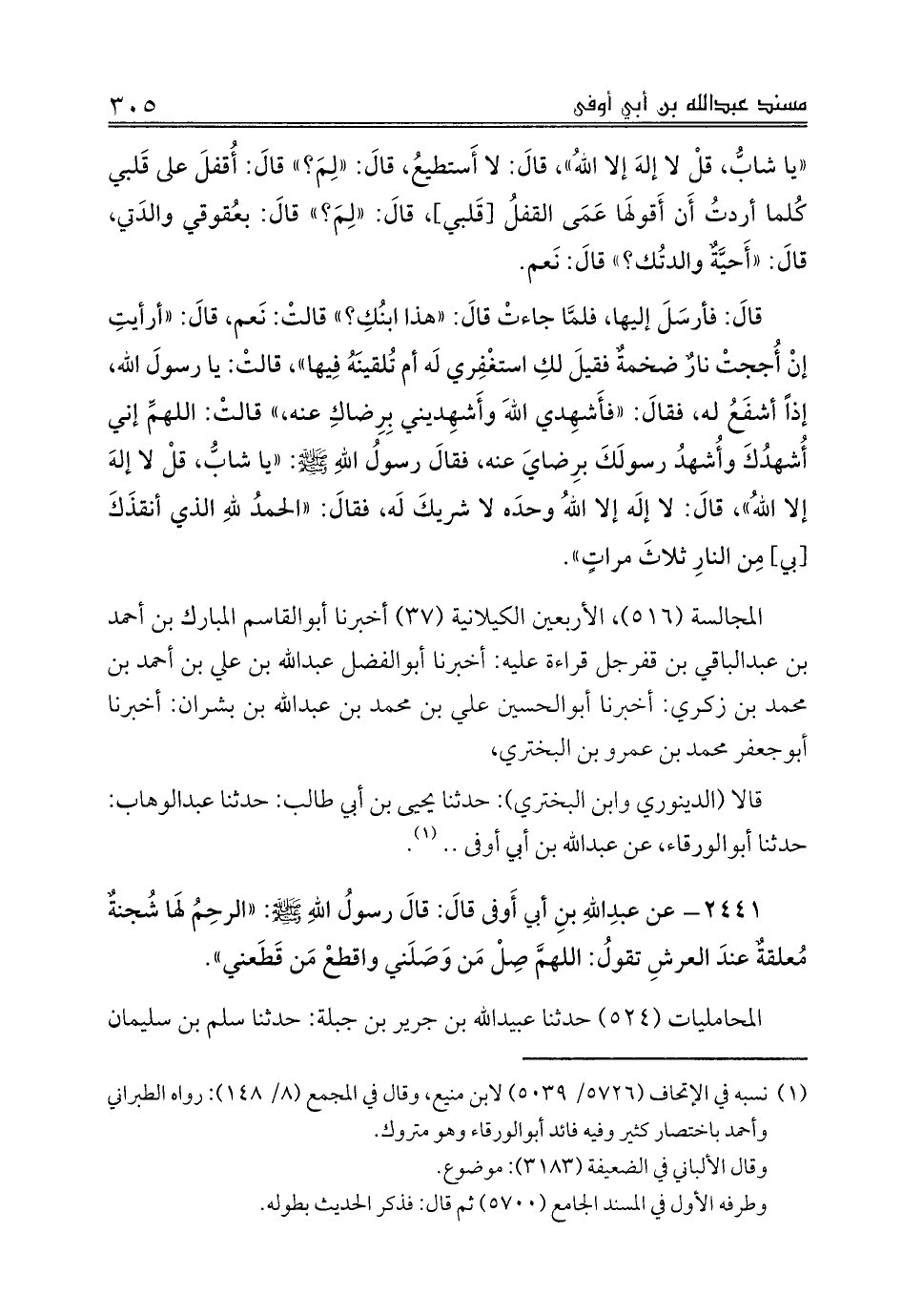 قالا (الدينوري وابن البختري): حدثنا يحيى بن أبي طالب: حدثنا عبدالوهاب: حدثنا أبوالورقاء، عن عبدالله بن أبي أوفى .. (¬1).