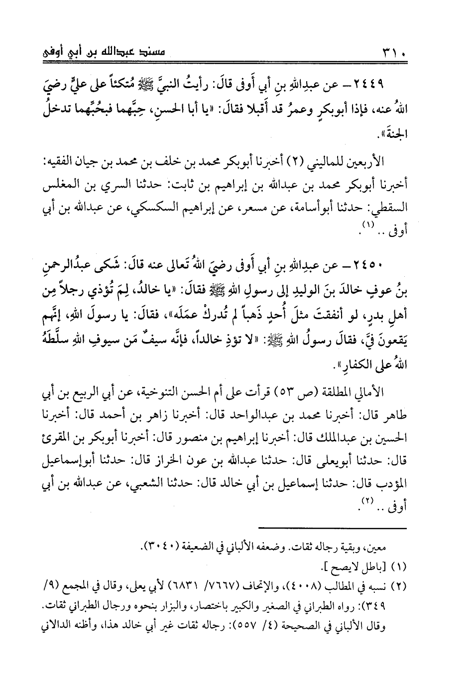 2449 - عن عبدِاللهِ بنِ أبي أَوفى قالَ: رأيتُ النبيَّ صلى الله عليه وسلم مُتكئاً على عليٍّ رضيَ اللهُ عنه، فإذا أبوبكرٍ وعمرُ قد أَقبلا فقالَ: «يا أبا الحسنِ، حِبَّهما فبحُبِّهما تدخلُ الجنةَ».