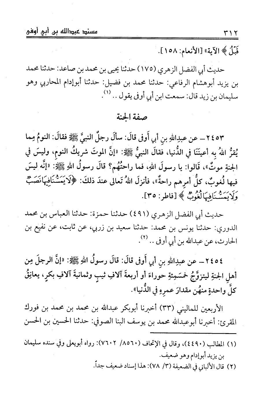 2453 - عن عبدِاللهِ بنِ أبي أَوفى قالَ: سألَ رجلٌ النبيَّ صلى الله عليه وسلم فقالَ: النومُ مِما يُقرُّ اللهُ بِه أعينَنَا في الدُّنيا، فقالَ النبيُّ صلى الله عليه وسلم: «إنَّ الموتَ شريكُ النومِ، وليسَ في الجنةِ موتٌ»، قَالوا: يا رسولَ اللهِ، فما راحتُهُم؟ قالَ رسولُ اللهِ صلى الله عليه وسلم: «إنَّه ليسَ فيها لُغوبٌ، كلُّ أمرِهم راحةٌ»، فأنزلَ اللهُ تَعالى عندَ ذلكَ: {لَا يَمَسُّنَا فِيهَا نَصَبٌ وَلَا يَمَسُّنَا فِيهَا لُغُوبٌ} [فاطر: 35].