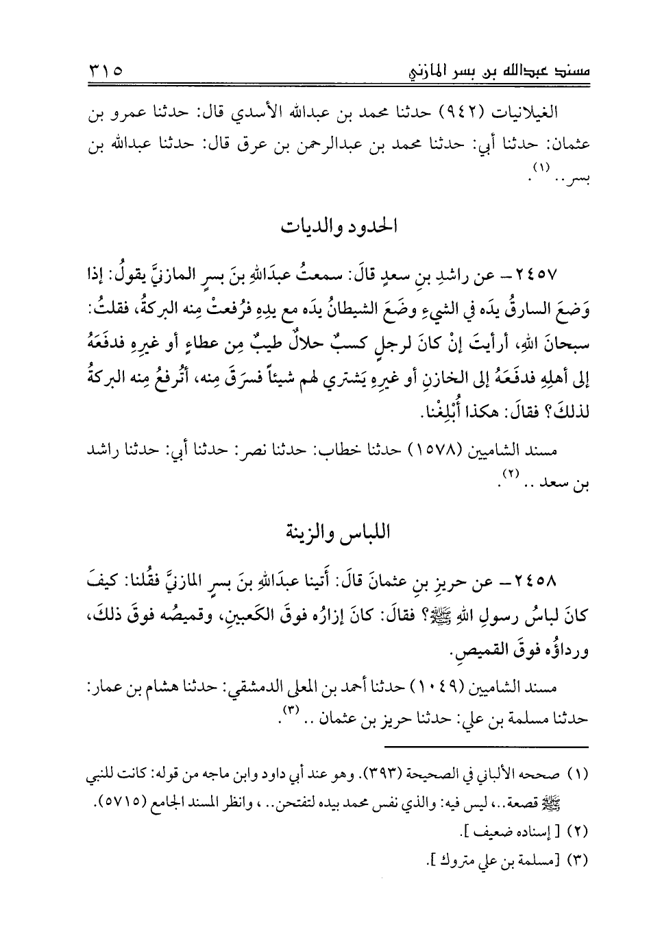 2458 - عن حريزِ بنِ عثمانَ قالَ: أَتينا عبدَاللهِ بنَ بسرٍ المازنيَّ فقُلنا: كيفَ كانَ لباسُ رسولِ اللهِ صلى الله عليه وسلم؟ فقالَ: كانَ إزارُه فوقَ الكَعبينِ، وقميصُه فوقَ ذلكَ، ورداؤُه فوقَ القميصِ.