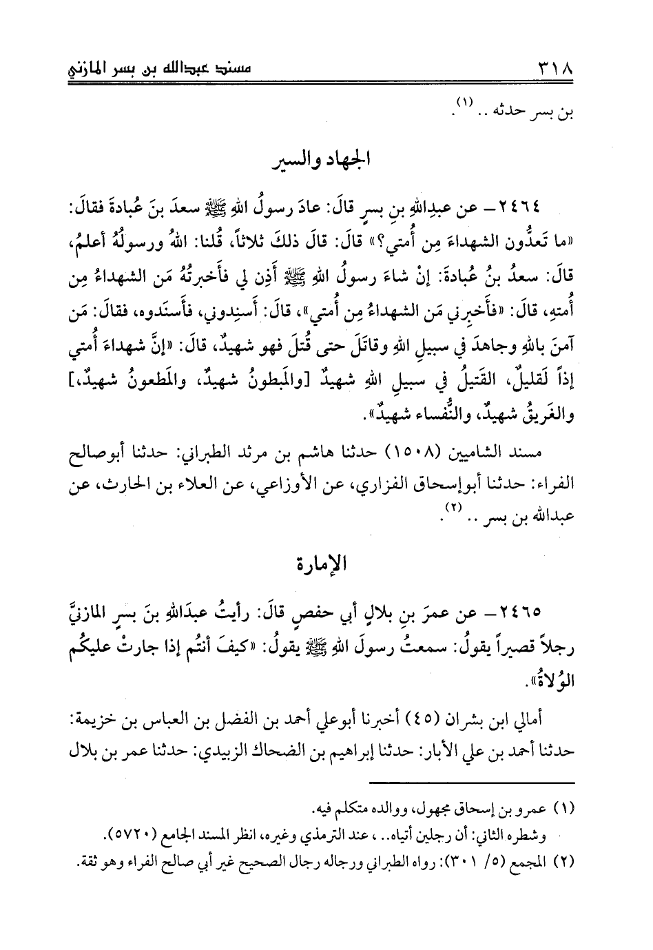 2464 - عن عبدِاللهِ بنِ بسرٍ قالَ: عادَ رسولُ اللهِ صلى الله عليه وسلم سعدَ بنَ عُبادةَ فقالَ: «ما تَعدُّون الشهداءَ مِن أُمتي؟» قالَ: قالَ ذلكَ ثلاثاً، قُلنا: اللهُ ورسولُهُ أعلمُ، قالَ: سعدُ بنُ عُبادةَ: إنْ شاءَ رسولُ اللهِ صلى الله عليه وسلم أَذِن لي فأَخبرتُهُ مَن الشهداءُ مِن أُمتهِ، قالَ: «فأَخبِرني مَن الشهداءُ مِن أُمتي»، قالَ: أَسنِدوني، فأَسنَدوه، فقالَ: مَن آمنَ باللهِ وجاهدَ في سبيلِ اللهِ وقاتَلَ حتى قُتلَ فهو شهيدٌ، قالَ: «إنَّ شهداءَ أُمتي إذاً لَقليلٌ، القَتيلُ في سبيلِ اللهِ شهيدٌ [والمَبطونُ شهيدٌ، والمَطعونُ شهيدٌ،] والغَريقُ شهيدٌ، والنُّفساء شهيدٌ».