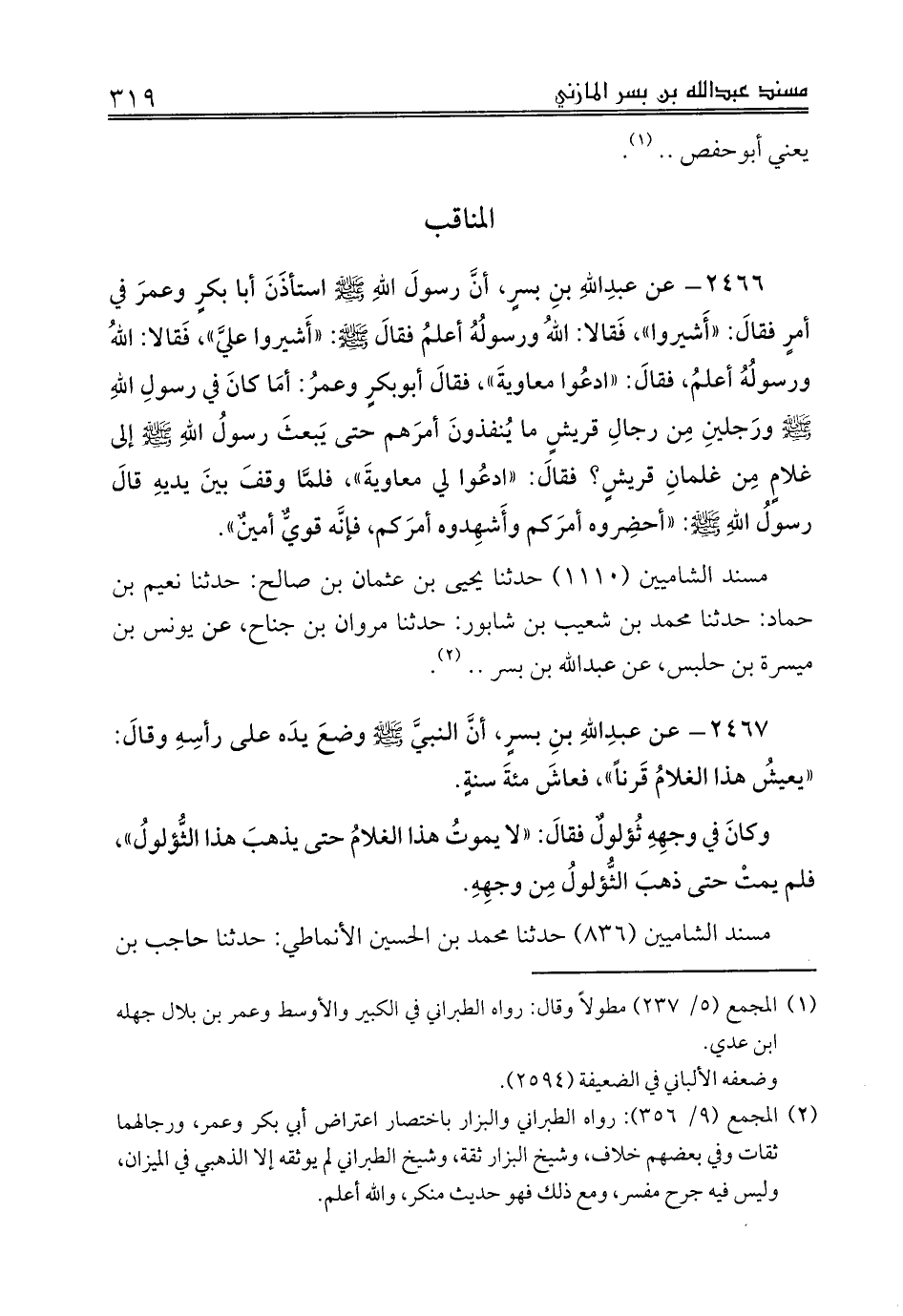مسند الشاميين (1110) حدثنا يحيى بن عثمان بن صالح: حدثنا نعيم بن حماد: حدثنا محمد بن شعيب بن شابور: حدثنا مروان بن جناح، عن يونس بن ميسرة بن حلبس، عن عبدالله بن بسر .. (¬2).