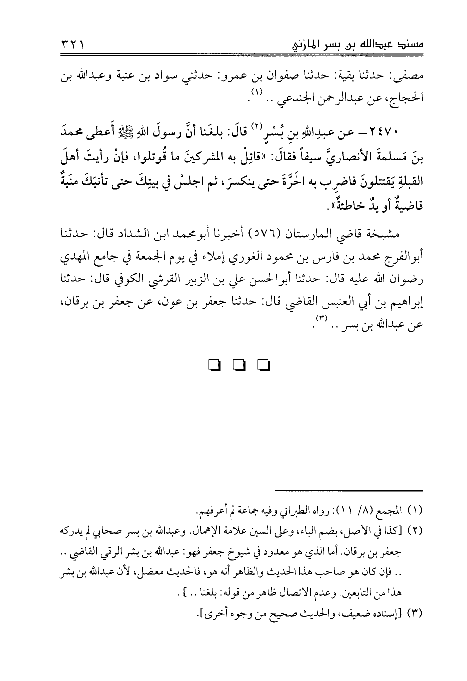 2470 - عن عبدِاللهِ بنِ بُسْرٍ (¬2) قالَ: بلغَنا أنَّ رسولَ اللهِ صلى الله عليه وسلم أَعطى محمدَ بنَ مَسلمةَ الأنصاريَّ سيفاً فقالَ: «قاتِلْ به المشركينَ ما قُوتلوا، فإنْ رأيتَ أهلَ القبلةِ يَقتتلونَ فاضرِب به الحَرَّةَ حتى ينكسرَ، ثم اجلسْ في بيتِكَ حتى تأتيَكَ منَيةٌ قاضيةٌ أو يدٌ خاطئةٌ».